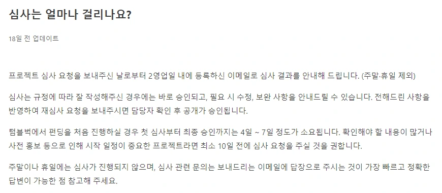 다른 건 어떻게든 맞출 수 있을 텐데, 문제는 펀딩 심사였다. 펀딩 심사는 보통 2 영업일 이내 완료되지만, 첫 펀딩은 4~7일이 소요된다고 적혀있었다. 첫 펀딩을 진행하는 우리는 자칫 심사에만 7일이 걸릴 수도 있는 상황. 걱정스러운 마음에 메일로 문의를 남겼다. 그리고 "우선 심사를 검토해보겠다"는 답변을 받았다. 안도했다. 하지만 다음 번에 또 다시 펀딩을 하게 된다면, 꼭 스케줄에 여유를 두어야겠다고 생각했다.