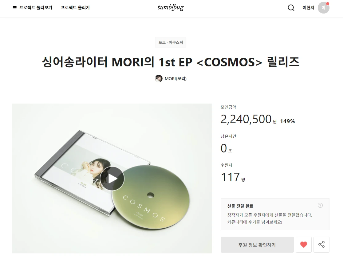 음반 발매를 위해 크라우드 펀딩을 선택한 우리는 또 다시 와디즈와 텀블벅이라는 선택지를 놓고 고민했다. 와디즈는 숱한 스타트업들이 있는 만큼 왠지 더 큰 금액이 모일 것 같았고, 텀블벅은 아티스트 펀딩에 특화되어있어 우리를 더 상위 노출시켜줄 것 같았다. 결국, 우리는 타 아티스트들의 레퍼런스가 훨씬 많은 텀블벅에서 MORI의 첫 EP앨범, <COSMOS> 제작 크라우드 펀딩을 진행하기로 결정했다.