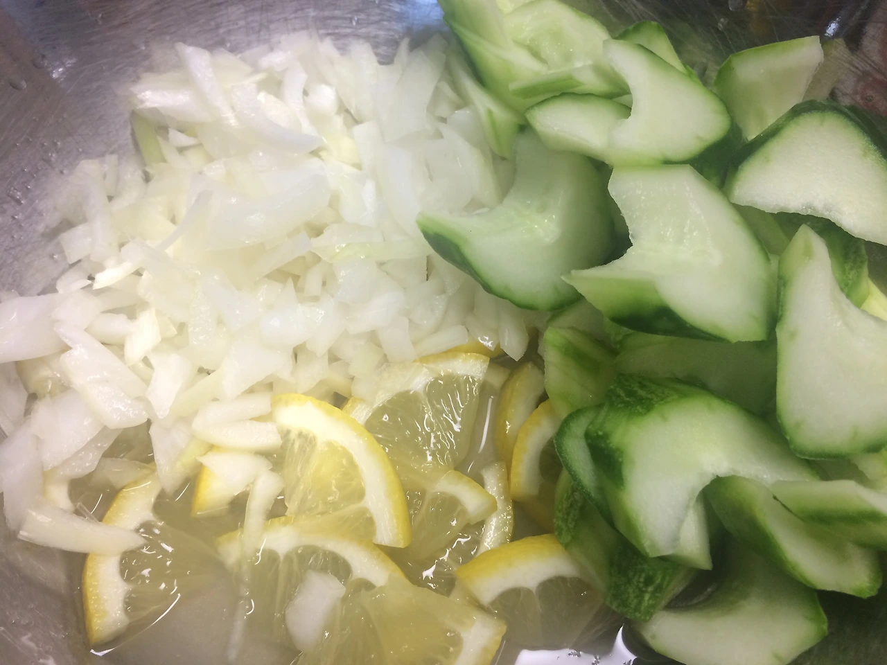 일반적으로 양파와 바질, 토마토로 만들지만 여름에 식욕을 돋우기 위해 레몬과 오이를 첨가하고 오이의 향과 바질의 향이 부딪힐 수 있음을 감안하여 바질 대신 딜로 대체하였다.
