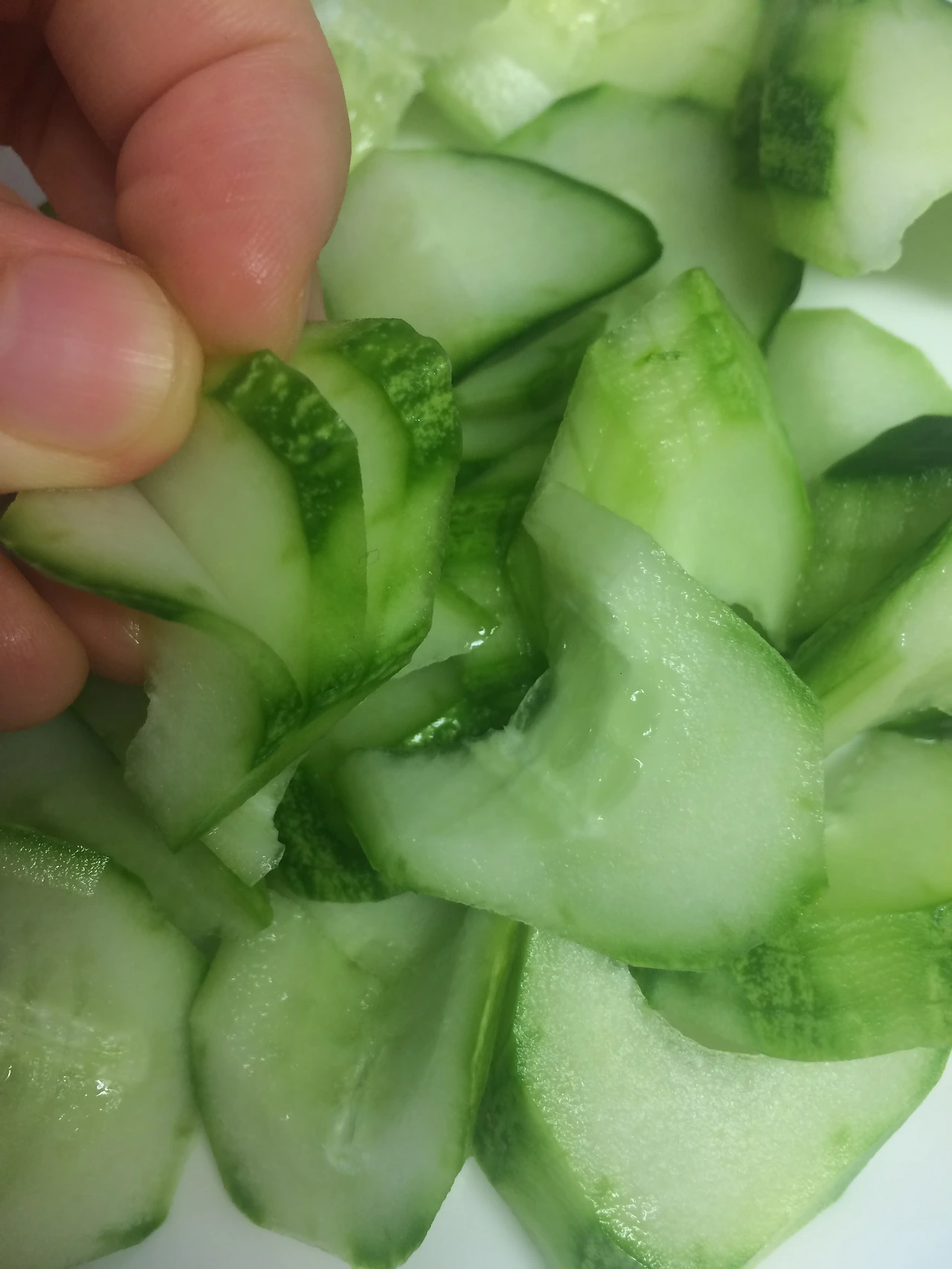 날씨의 영향으로 요즘 오이의 껍질에서 쓴 맛이 날 수 있으므로 완전히는 아니지만 필러로 벗겨 사용하길 추천한다. 오이씨 제거 후 잘 절여지도록 모양을 내어 썰어준다.