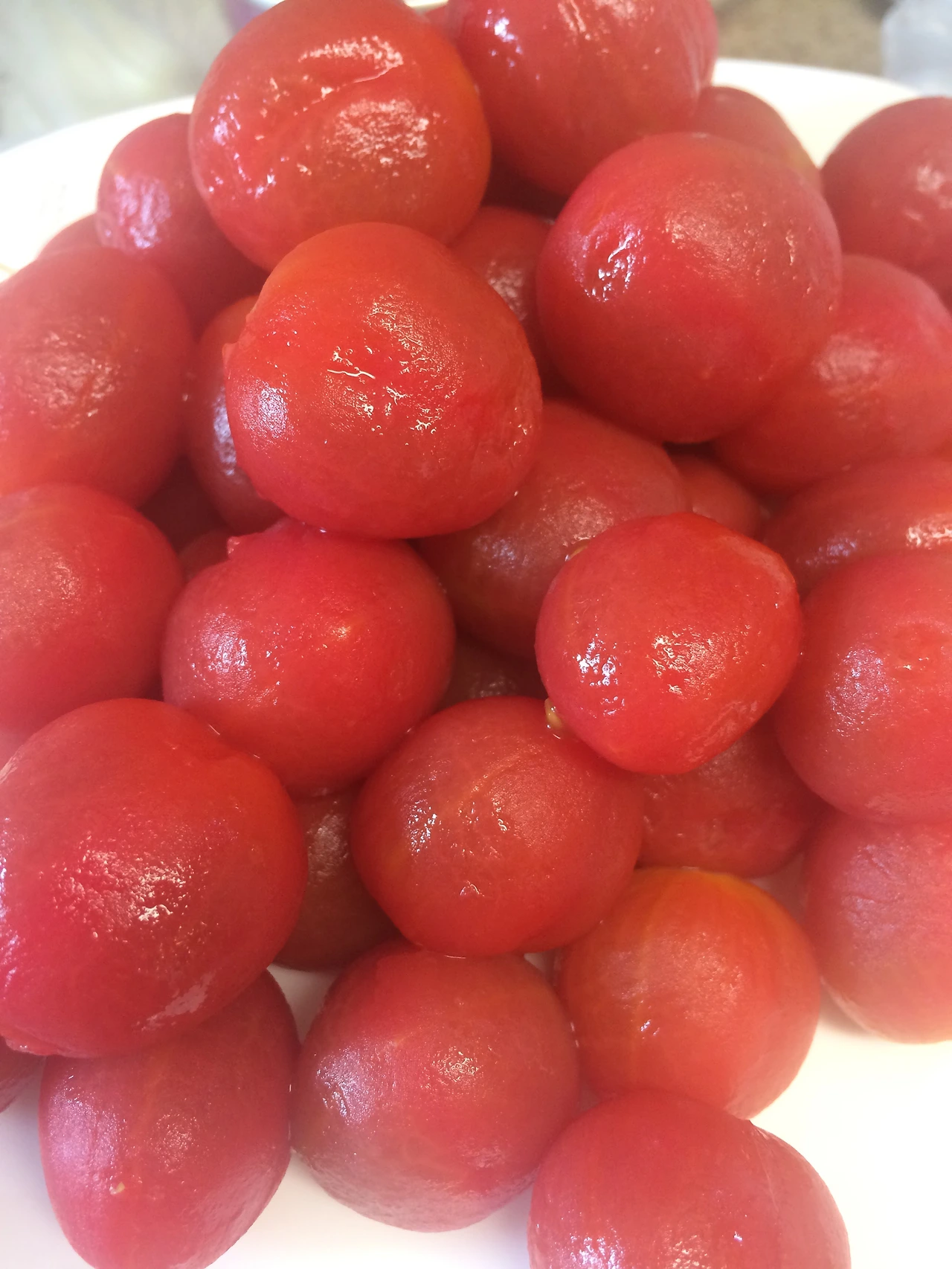 4. 방울 혹은 대추 토마토의 한 부분에 칼집을 내주고 소금을 넣은 끊은 물에 넣어준다.