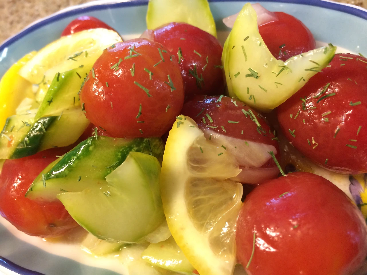 5. 냉장해 둔 채소 볼에 껍질을 벗긴 토마토를 넣고 딜 1T과 올리브유 3T를 넣고 섞는다.
