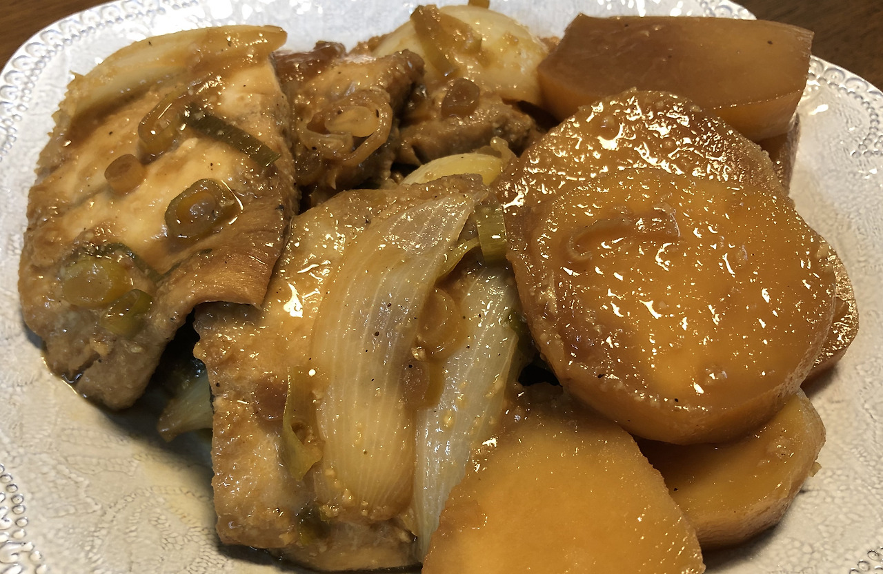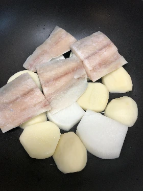 1. 무와 감자를 높이가 있는 냄비 혹은 프라이팬에 깐다