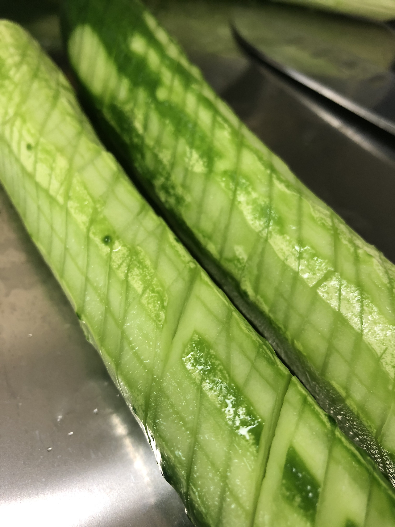 마라 황과를 만들 때, 만드는 이에 따라 오이의 써는 방법이 다른데 개인적으로 다음과 같은 방법이 만들고 난 후 다음 날이 되는 날에 식감이 최고였다.
