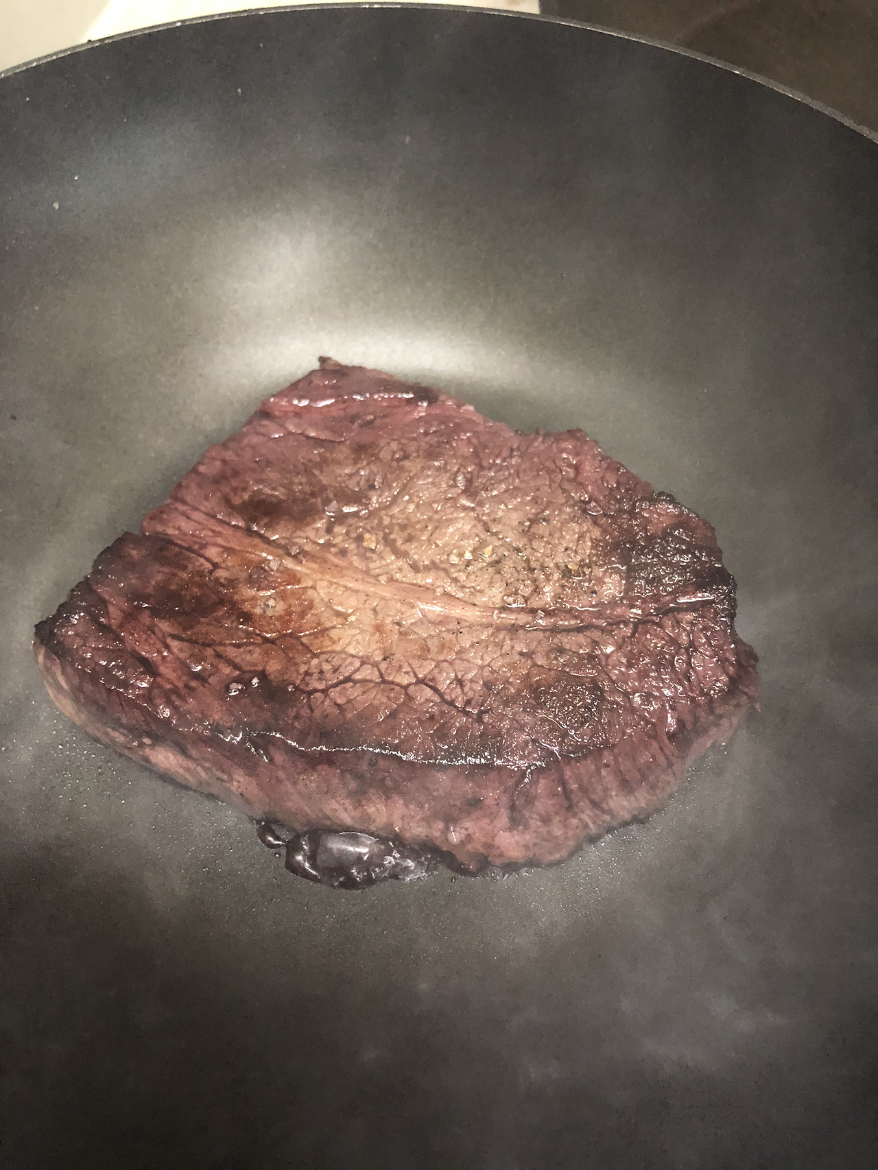 2. 앞뒤로 2분 정도 구워준 후 바로 레드 와인 1/2종이 컵을 부어 주어 재빠르게 익힌다. 구운 양지는 다른 그릇에 담아두고