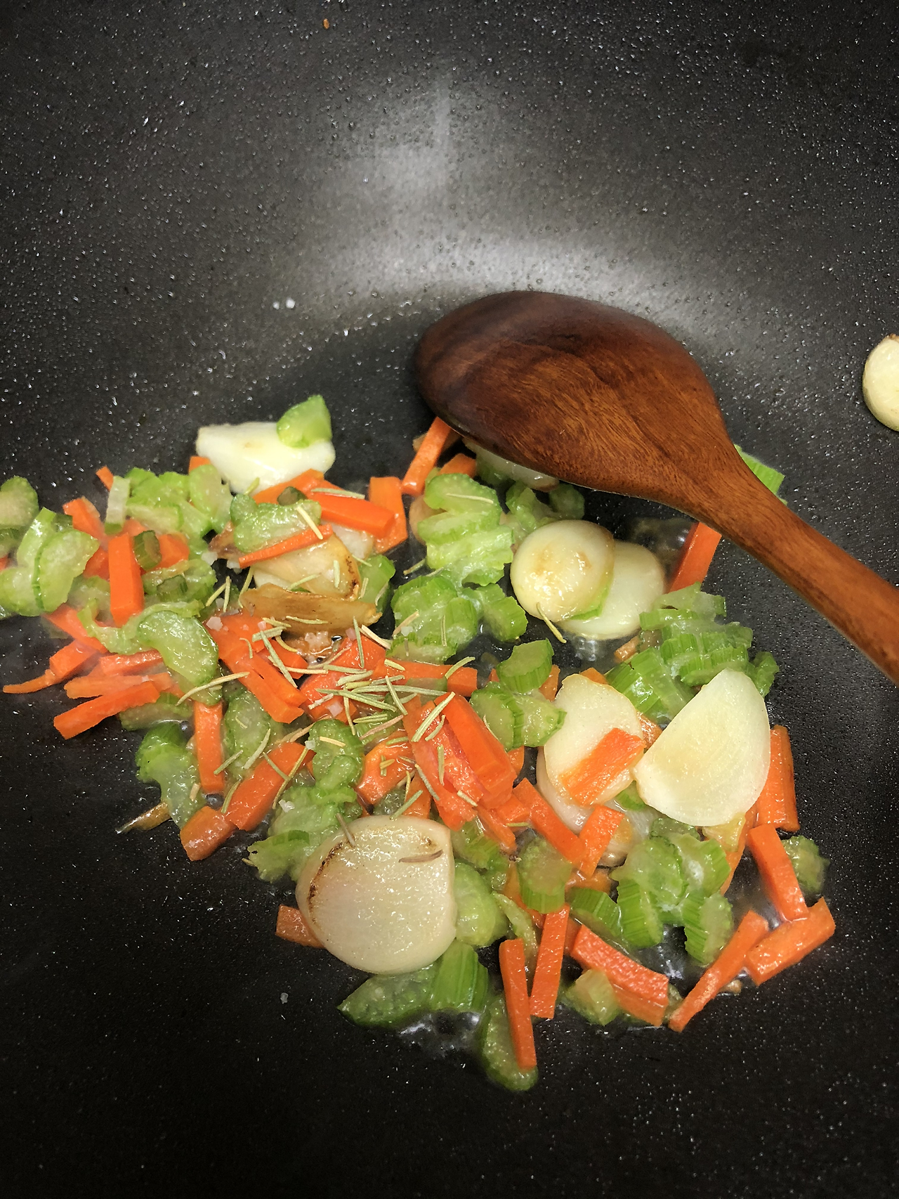 1. 올리브유 2T를 두르고 편 썬 마늘과 굵게 다진 당근과 샐러리에 로즈메리와 소금 간, 양파 가루 1T를 넣은 후 볶아 준다.