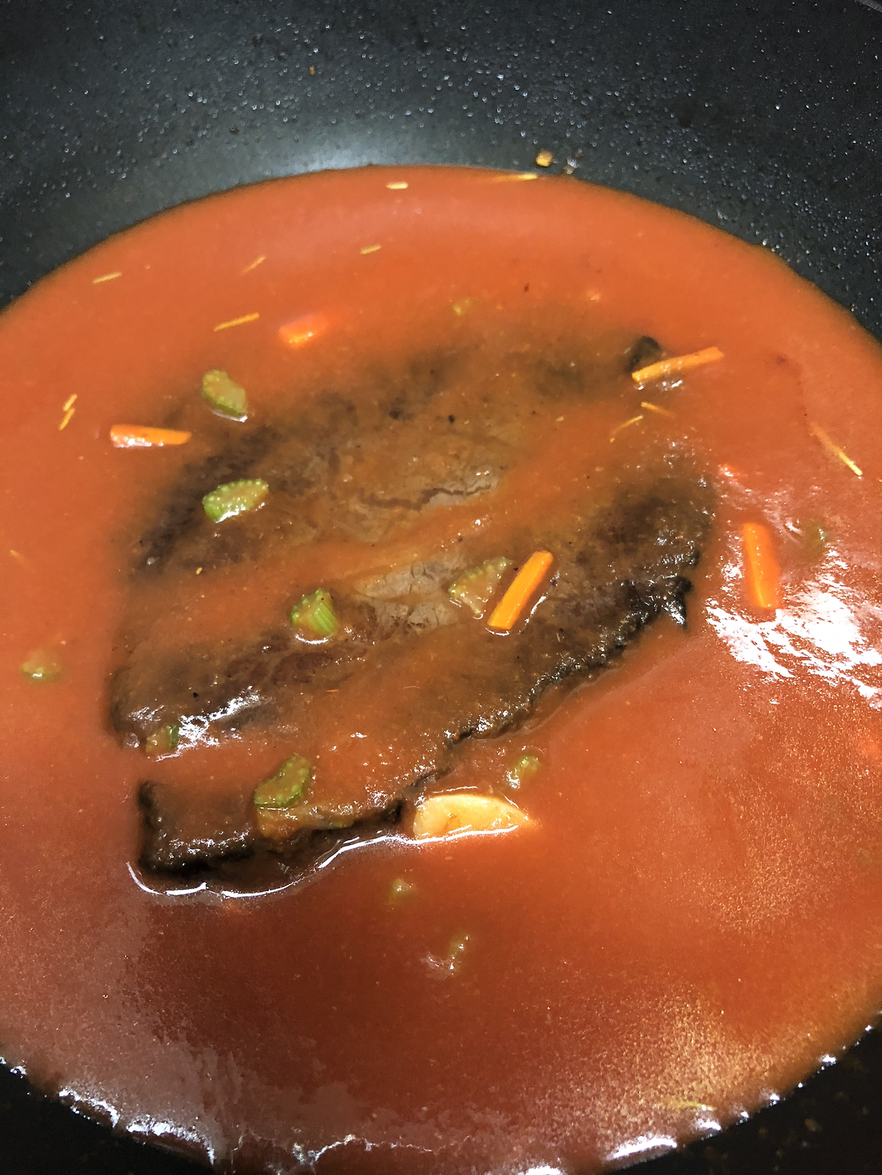 2. 투명하게 볶아지면 토마토 주스 500ml와 물 1L를 넣고 구운 양지를 넣고 센 불로 온도를 높여준다.