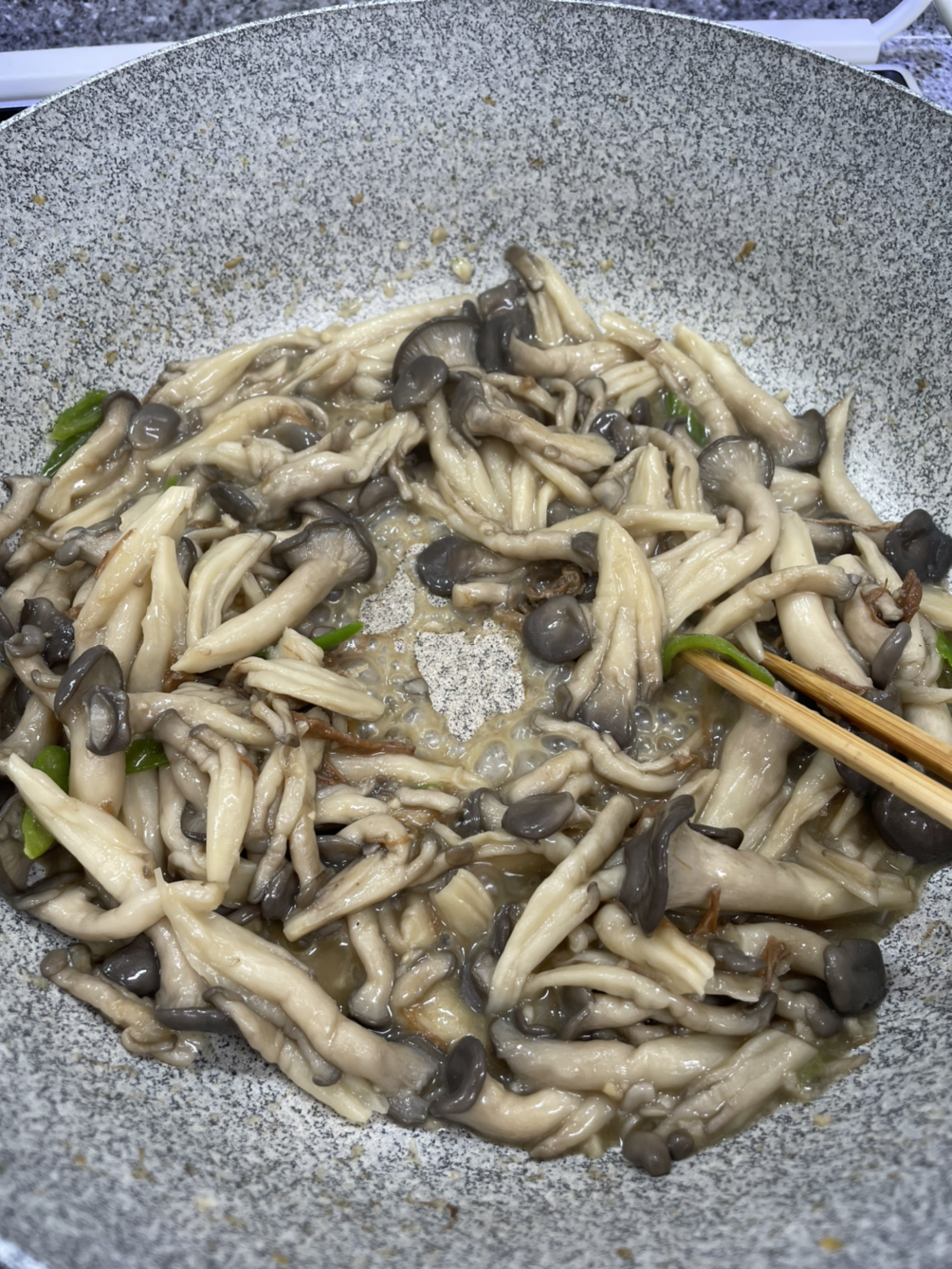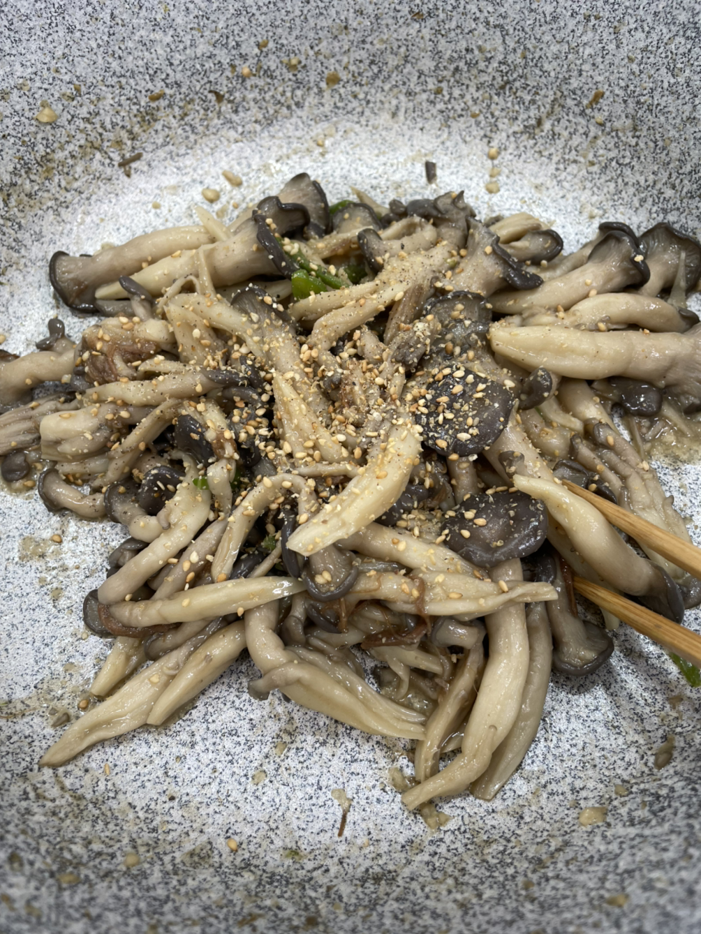 거의 바닥이 보일 때 버섯 하나를 먹어보고 본인에 맞게 소금, 후추 간을 한다. 간이 마무리가 되면 불을 끄고 참기름을 두르고 깨소금(통깨를 소금처럼 부순 것을 가리킴)을 뿌린다.
