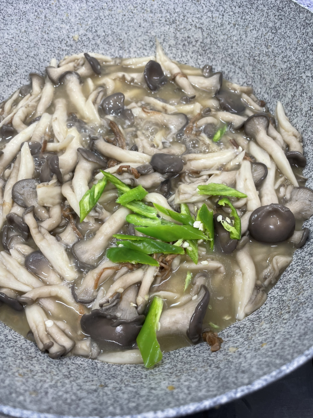이때 안 매운 꽈리고추 1개를 넣어주면 버섯에 향수를 뿌린 듯 향과 미묘한 맛을 더 높여준다.
