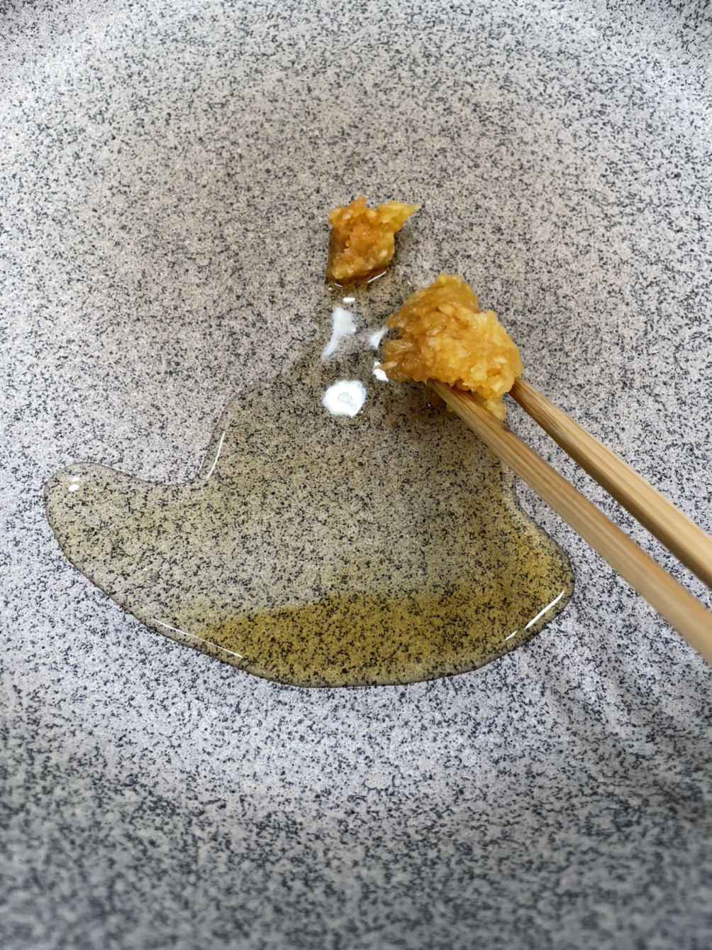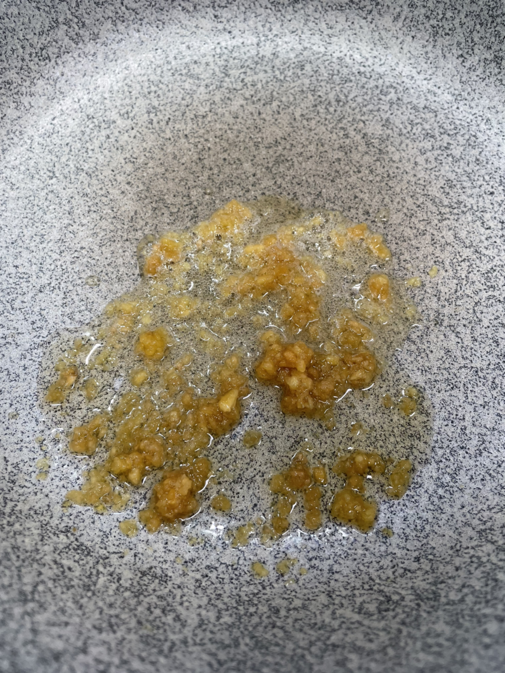 프라이 팬(중간 불)에 마늘과 참기름, 포도씨유를 1:1 넣고 마늘 향을 낸다. (참기름만 넣을 경우 쉽게 타버리기 때문에 포도씨유로 참기름이 타는 것을 예방하며 충분히 마늘의 향이 나도록 볶을 수 있다.)