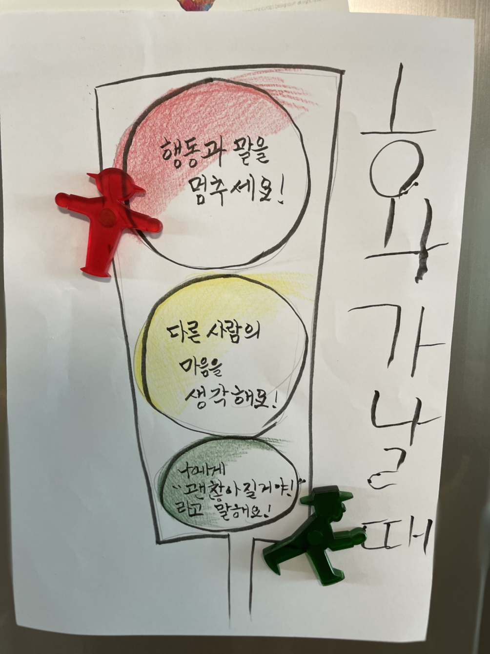 편안한 컨디션으로 돌아온 아이와 대화를 나누고, 앞으로 또 화가 나면 어떻게 하면 좋을지 이야기해보았다.
