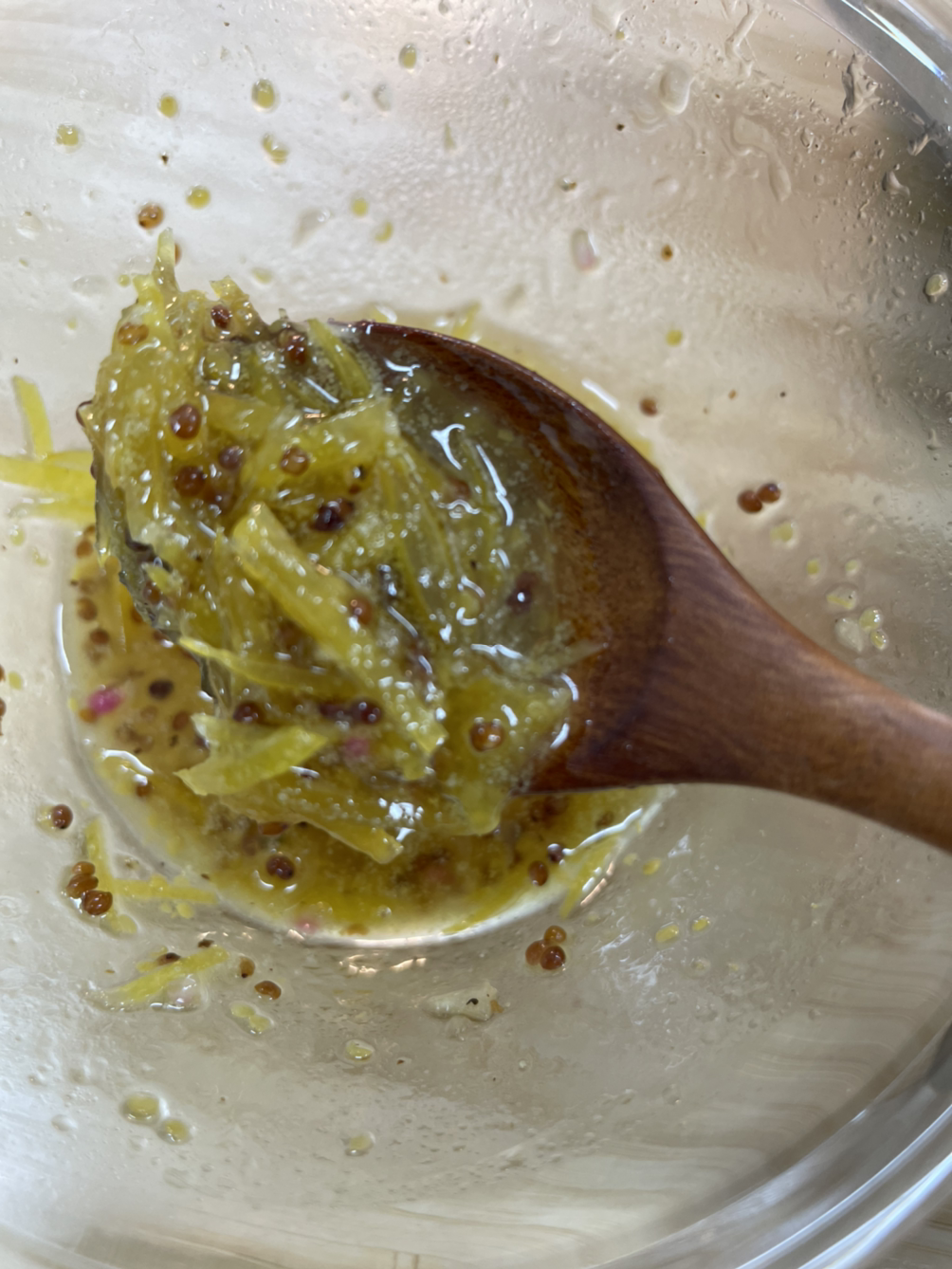 레몬은 반을 썰어 즙을 내고 아가베 시럽 1/2T(혹은 설탕 1T), 소금 1/4t, 후추 톡 한번 혹은 사각사각 두 번, 홀머스터드그레인 1/2t, 올리브유 4T
