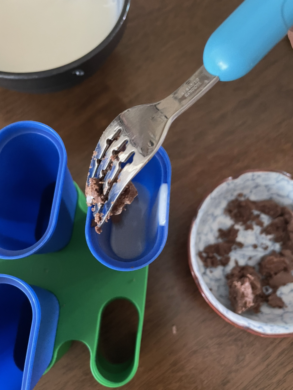 5. 맨 처음 초콜릿을 넣고 요거트를 넣는 작업을 반복 (초콜릿 넣기 -아이, 요거트 넣기 - 엄마)