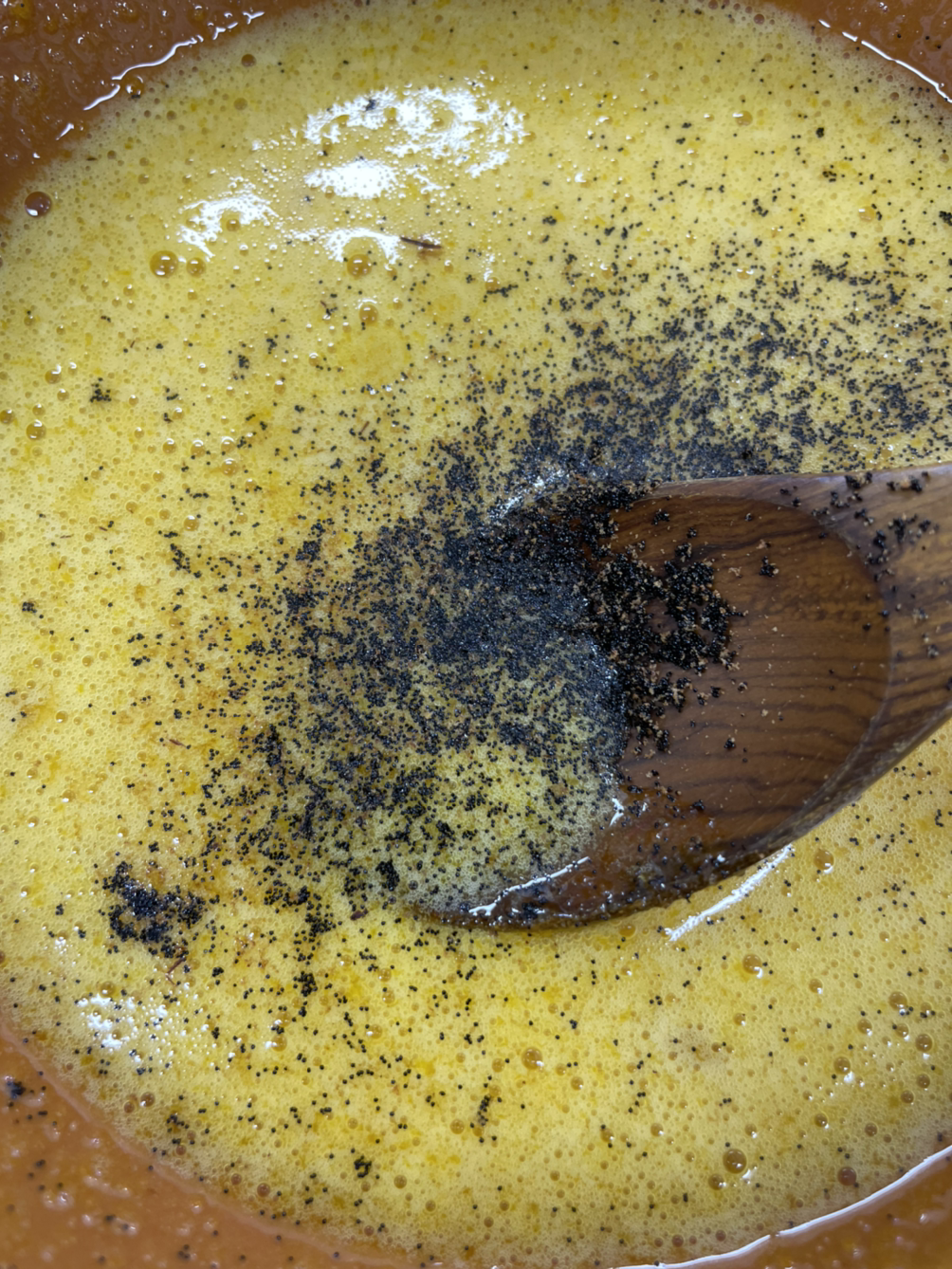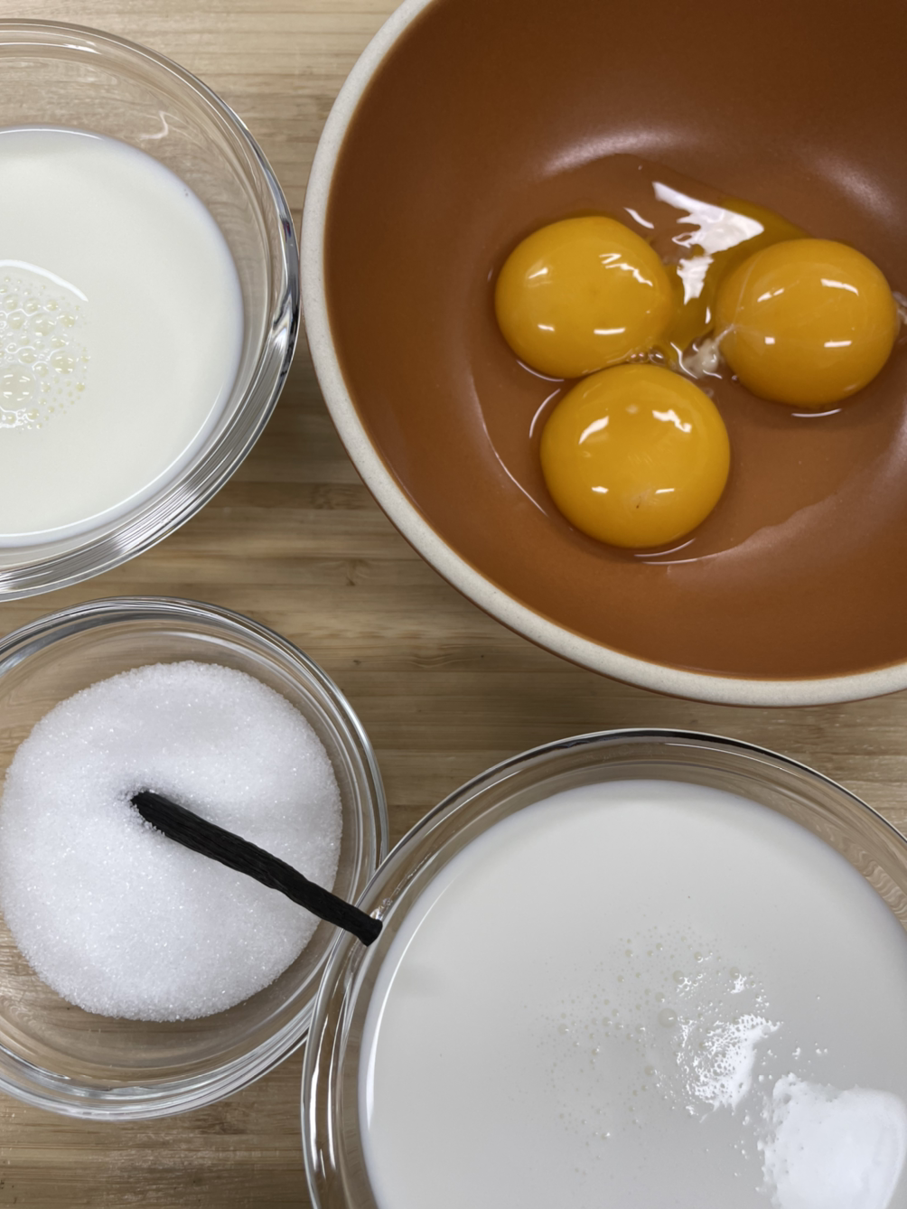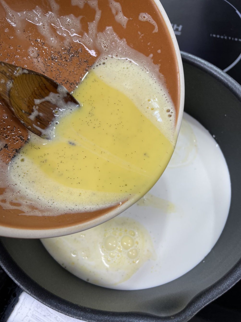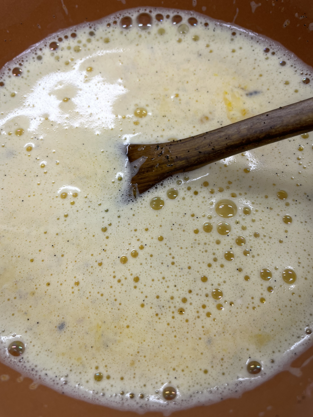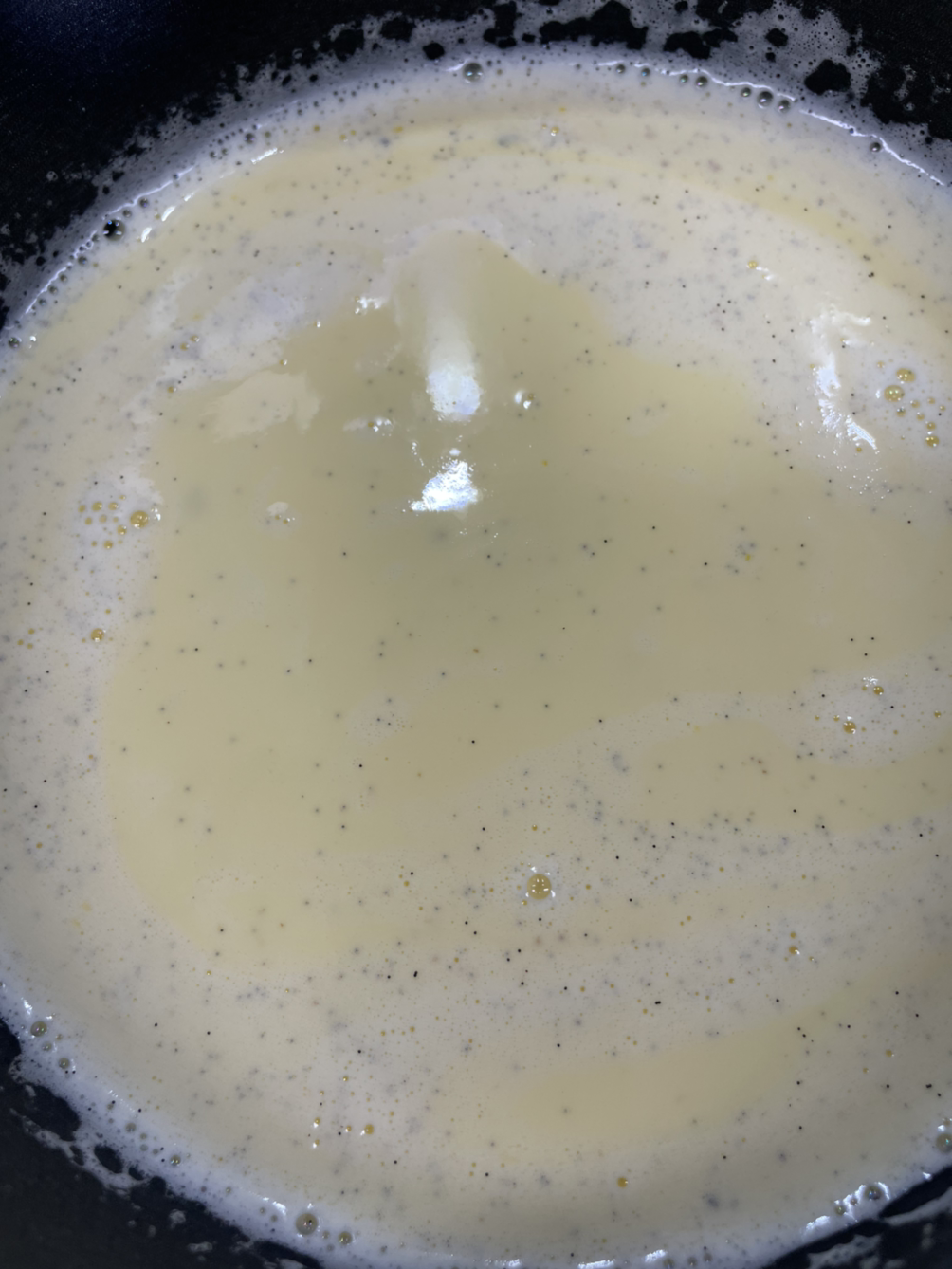 다 녹지 않았을 설탕을 녹입니다. 처음부터 냄비에 넣고 끓여도 되지만 종종 달걀을 익히는 일이 생겨서 이렇게 한 후 끓인 크림과 섞는 것이 누구에게나 안전한 방법 같아요.