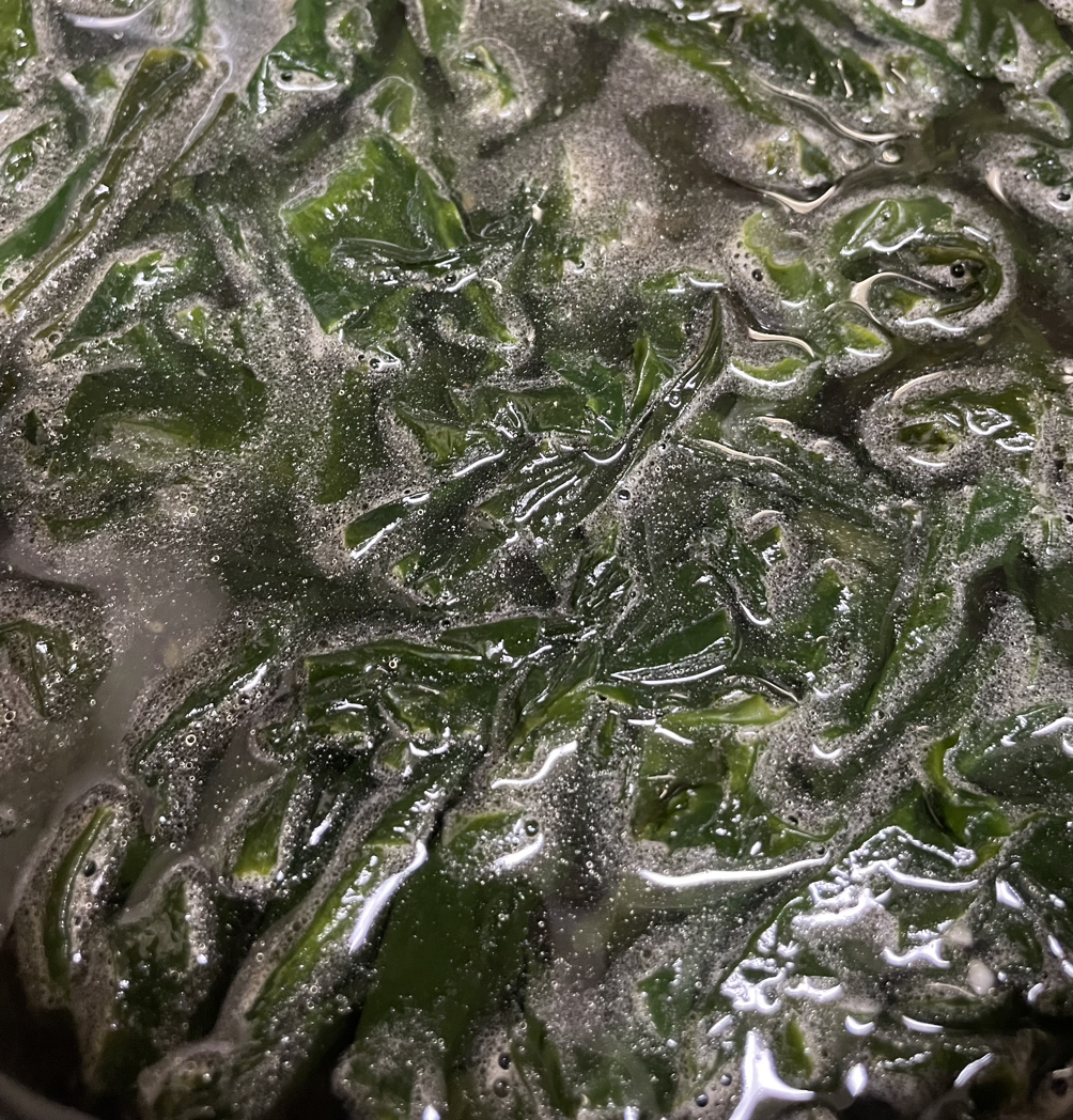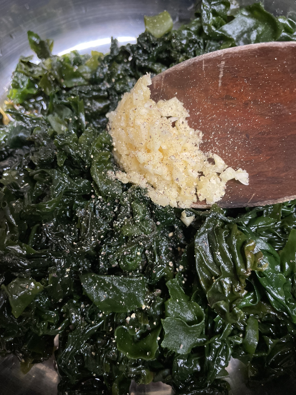 1. 씻어 놓은 미역에 간 마늘, 간장, 참기름을 넣고 볶습니다.