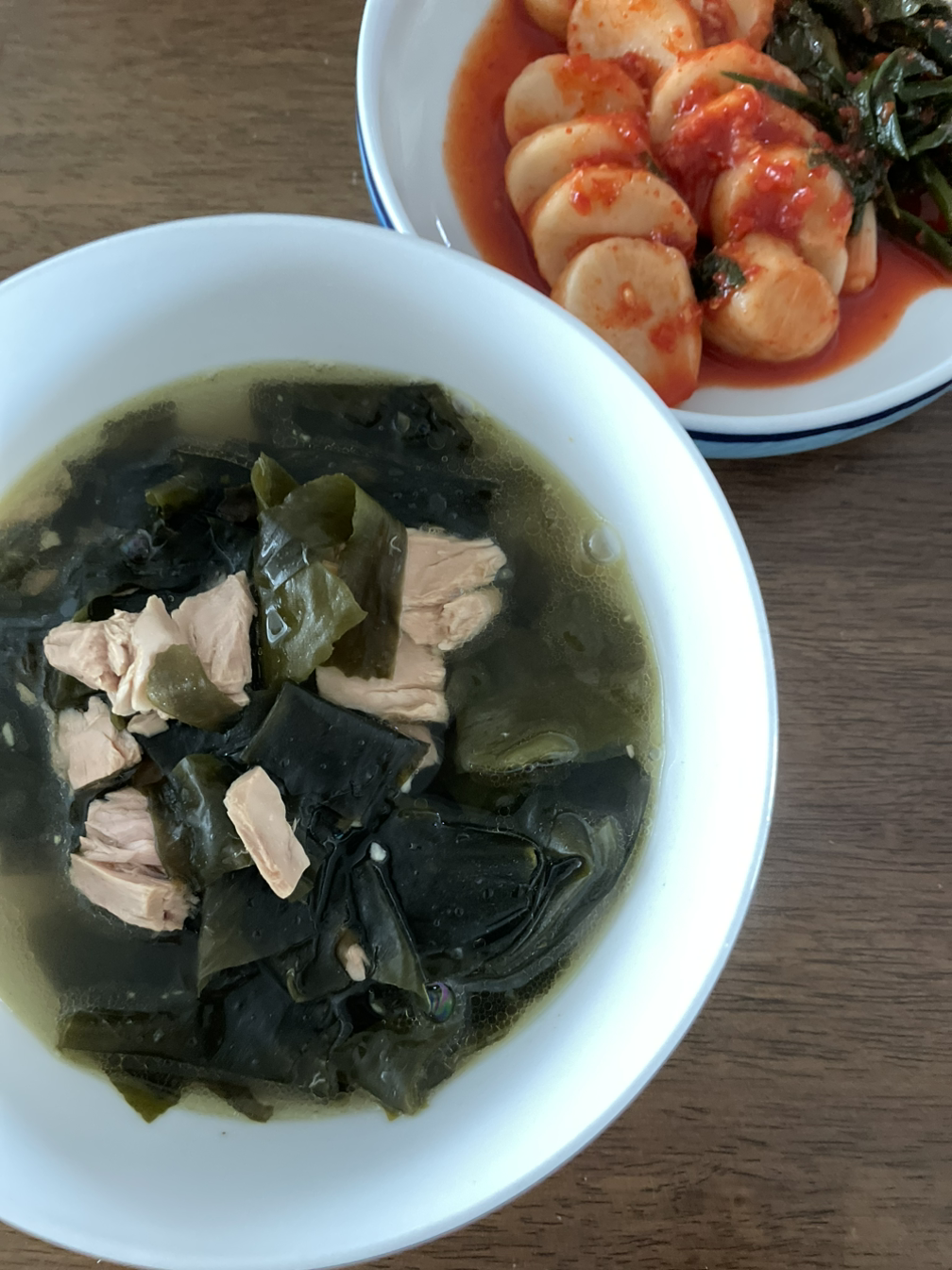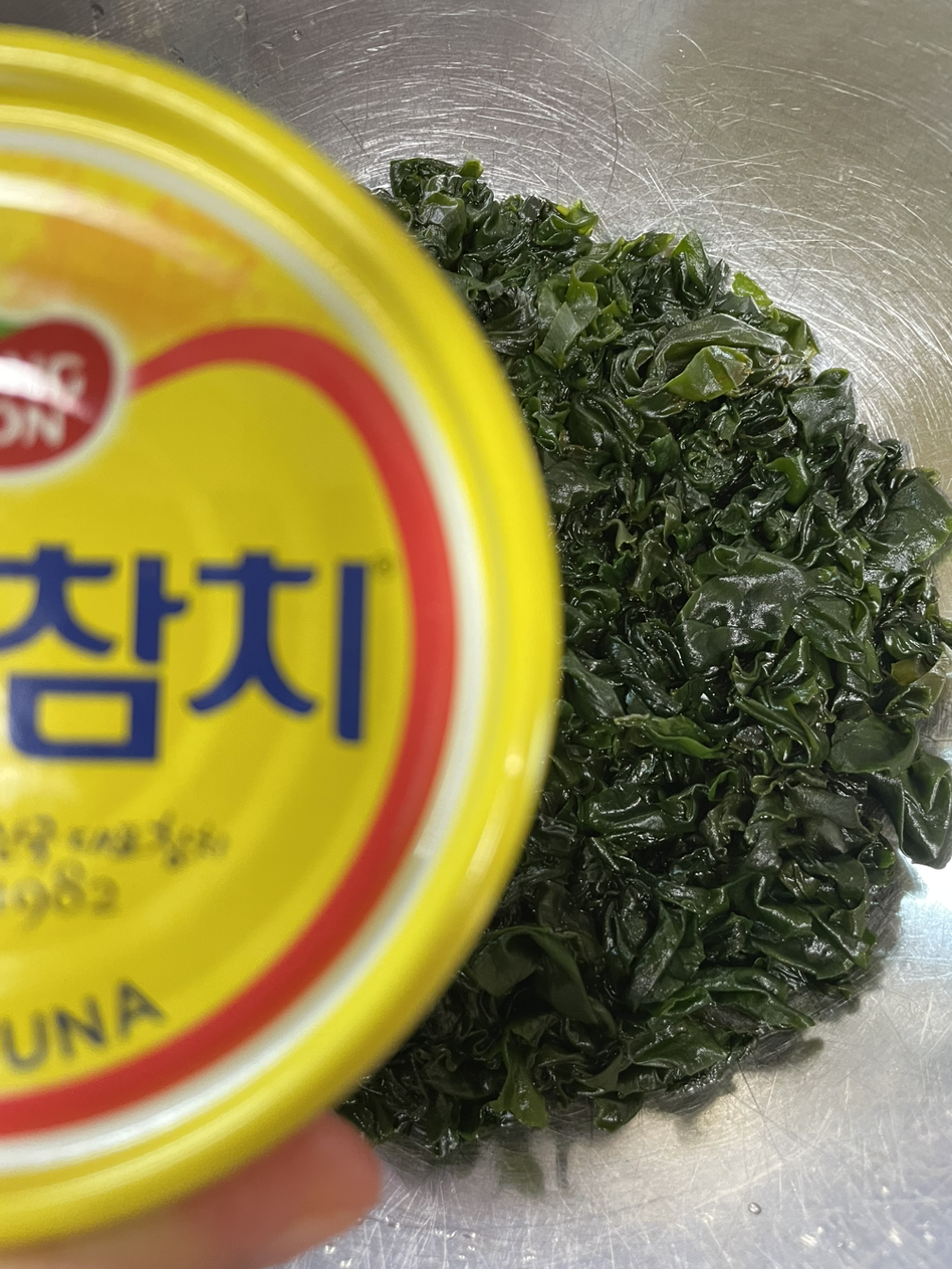마트에 가지 못해 집에 있는 것이 미역과 참치 캔 뿐이었어요.
