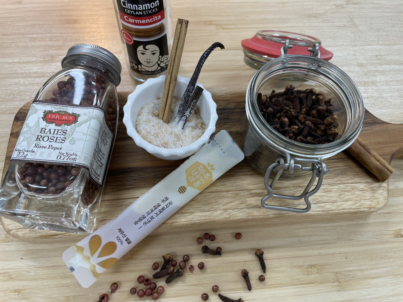 정향(clove), 후추, 시나몬 스틱, 바닐라 빈, 팔각(star anise), 향신료 넣을 포(티백 포나 거름망)