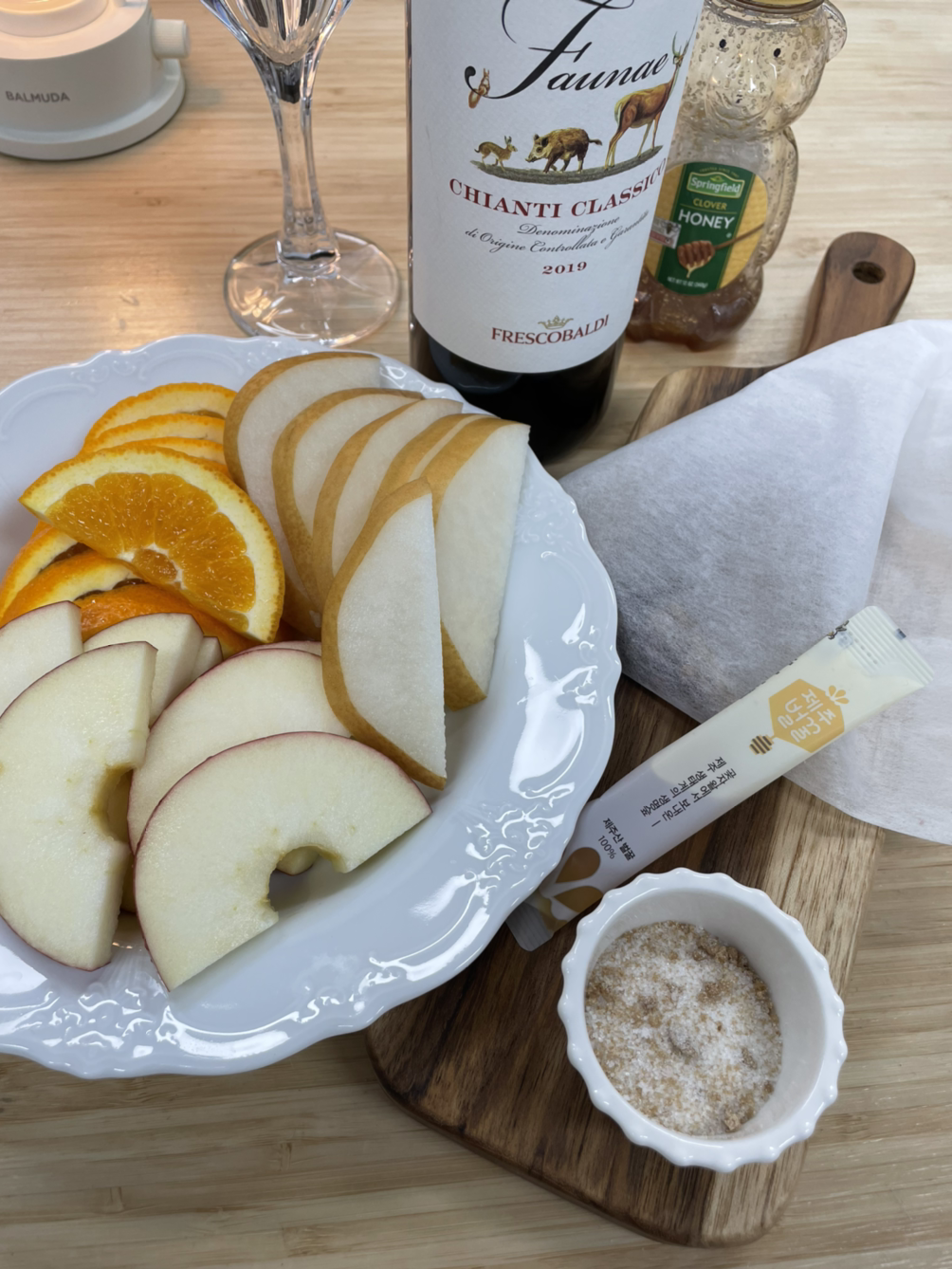 1. 모든 과일은 껍질째 이용할 예정이므로 과일 닦는 세정제(혹은 식초에 잠시 담가 그 물로 껍질을 닦습니다. )로 잘 닦아 물기를 제거합니다.