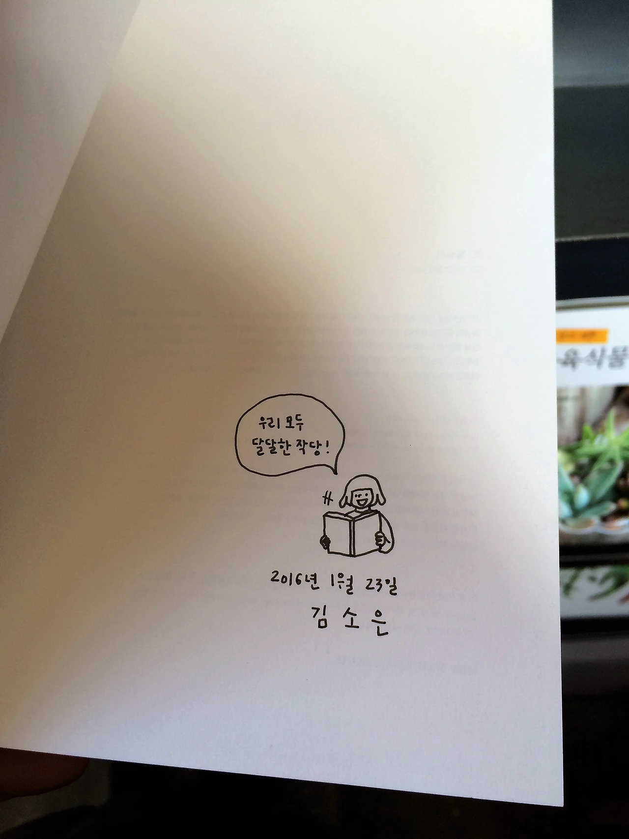 그림책의 저자가 와서 자신의 책에 본인이 글을 적어두고 갔다며 작당 대표는 책자를 보여주었다. 정말 신기하게도 그녀의 글씨가 책의 인쇄된 글씨로도 그리고 앞장의 직접 쓴 그녀의 필체로도 있었다. 만난 적은 없지만 김소은 씨 같은 필체였다.