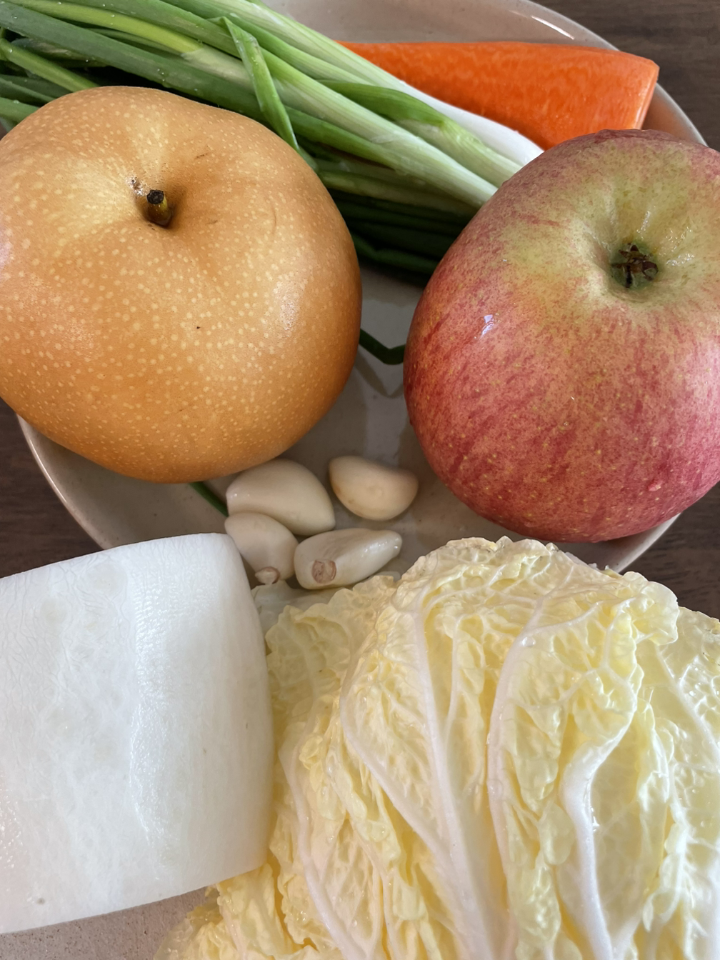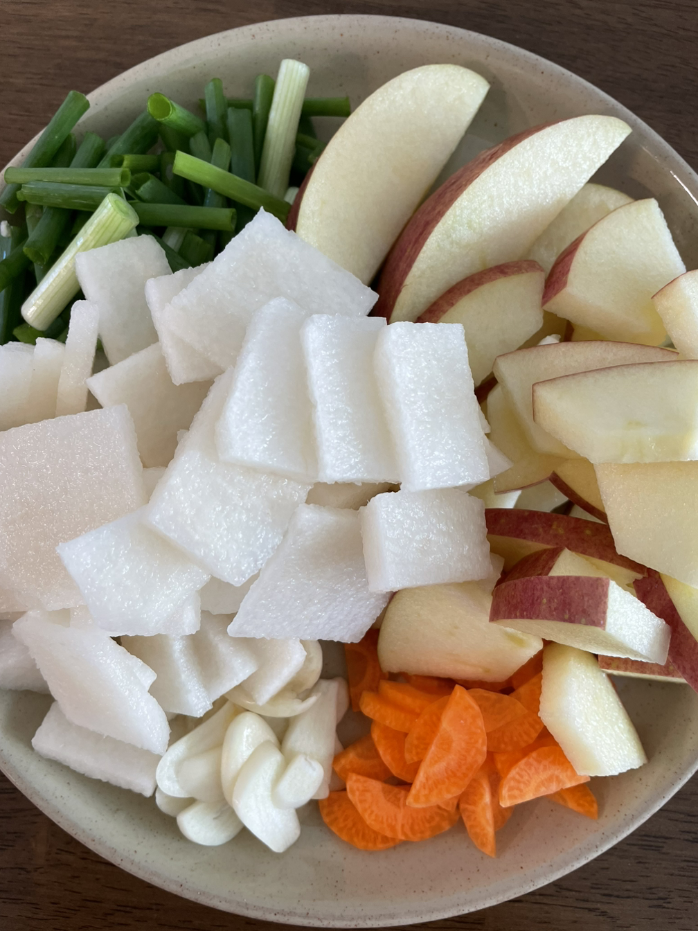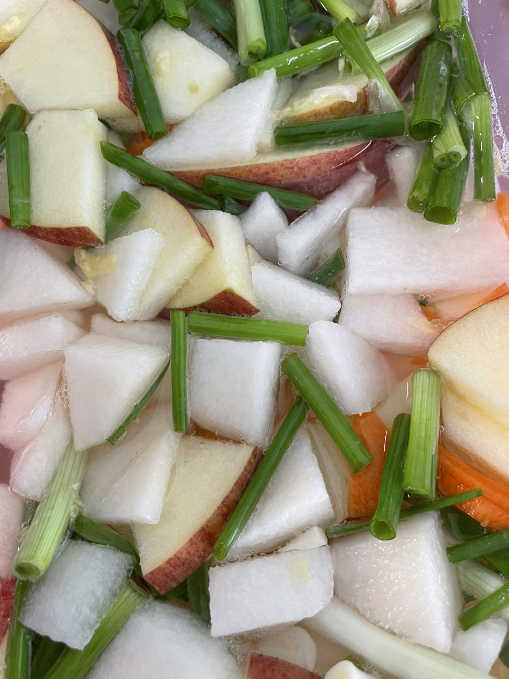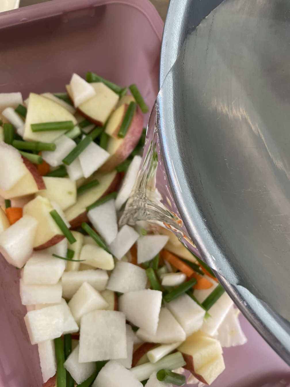5. 김치통에 절여둔 배추와 무, 쪽파, 당근, 사과, 배를 차곡히 넣어주고 소금을 푼 물을 부어줍니다.