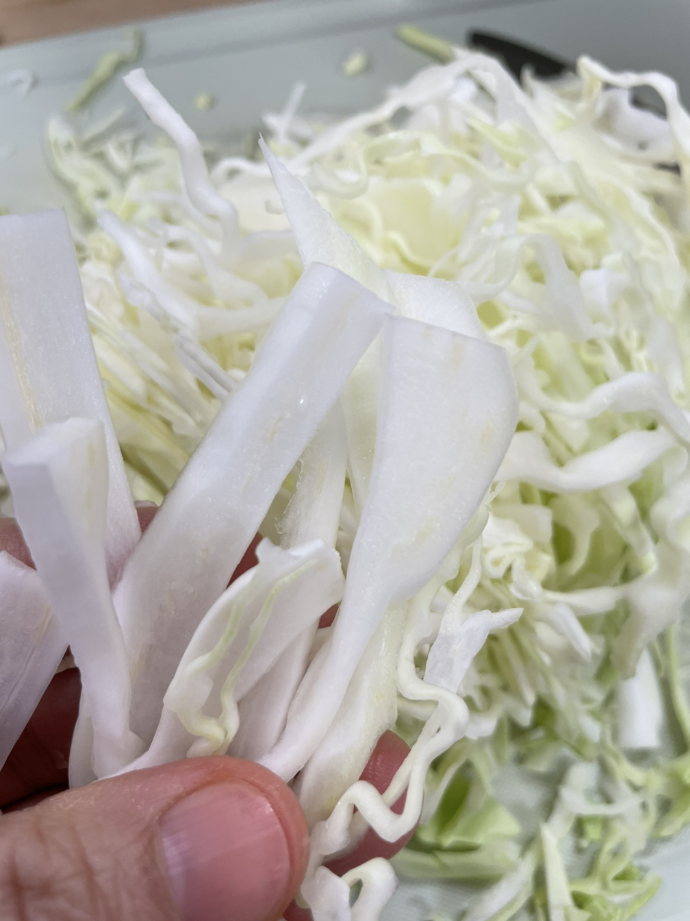 1) 양배추를 채 썰어 준비합니다. - 먹기에 불편한 심지는 제거하지만 얇게 썰어 함께 드셔보세요!