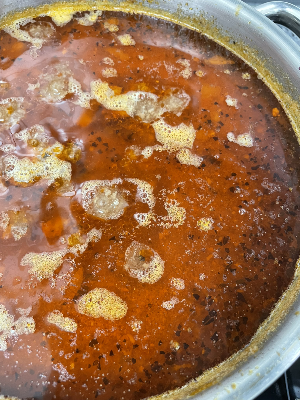 3. 고기가 익으면 시판하는 토마토소스 반통과 물 한 컵을 넣고 1시간 반 약불로 뚜껑을 덮고 끓입니다.