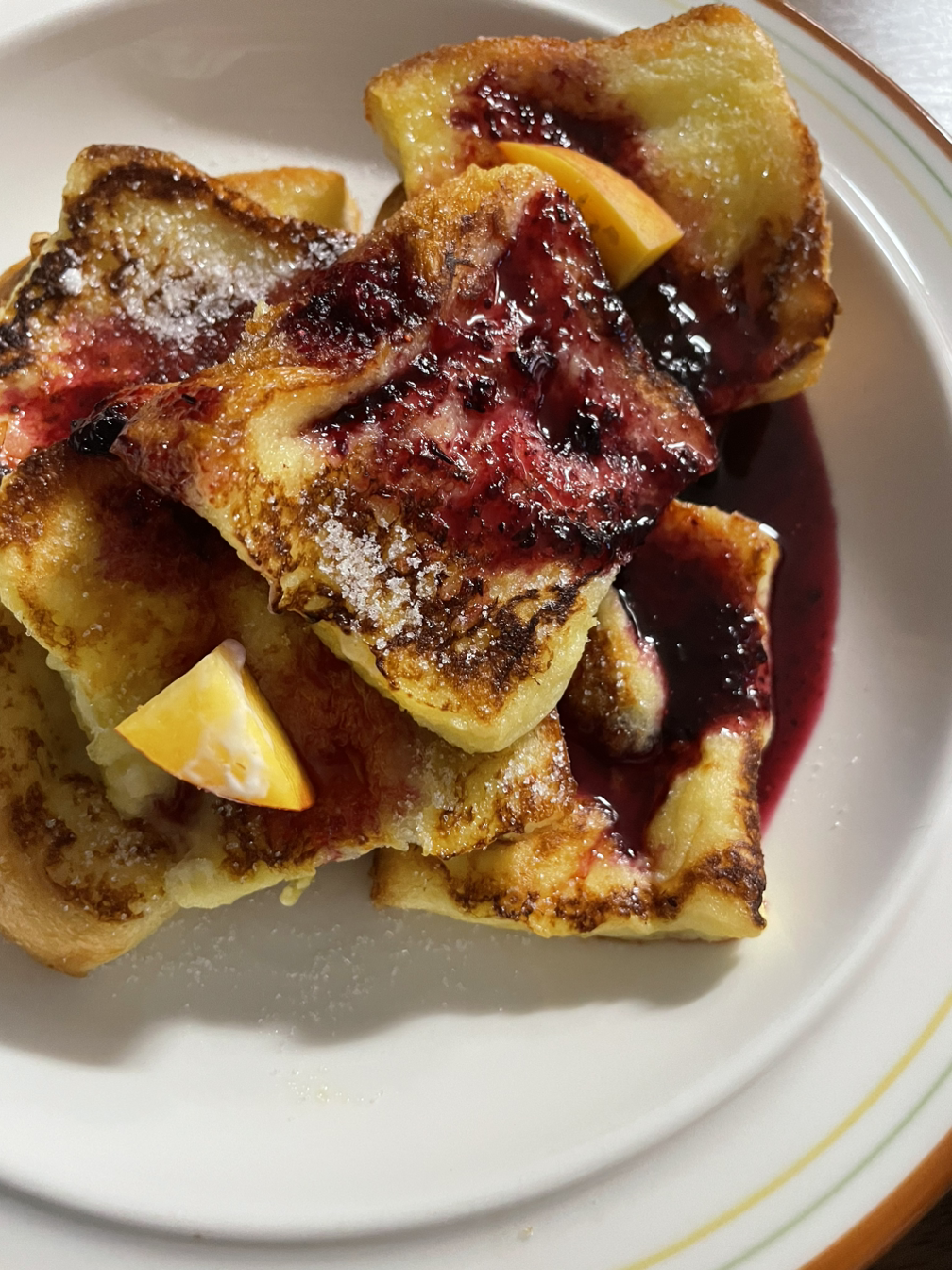 식빵 2조각, 달걀 1개, 소금 사각사각 3번(한 꼬집), 설탕 1/2 티스푼, 우유 1/3컵, 버터 1 티스푼, 잼 혹은 과일청