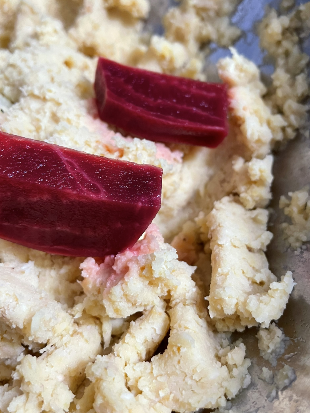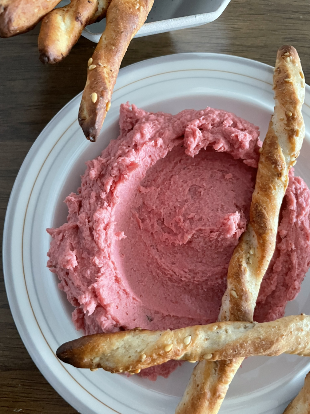 7. 완성된 후무스에 익힌 비트 15g과 아가베 시럽 1T, 올리브유 5T를 넣고 갈아서 완성합니다.