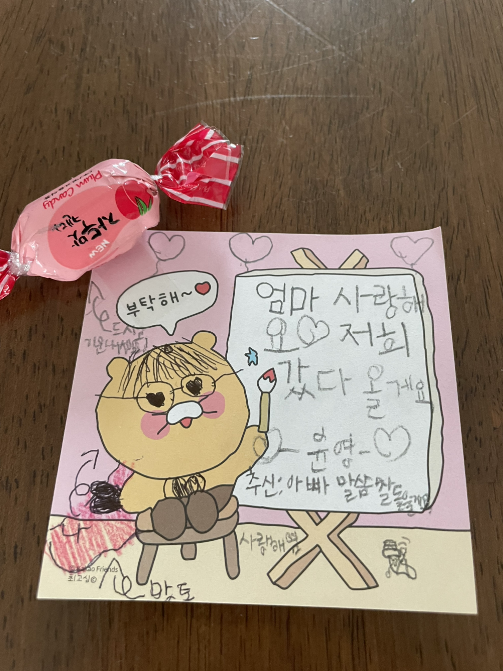 오늘 새벽엔 메모 한 장과 사탕을 남겨두고 아빠와 급 부산여행을 떠났습니다.