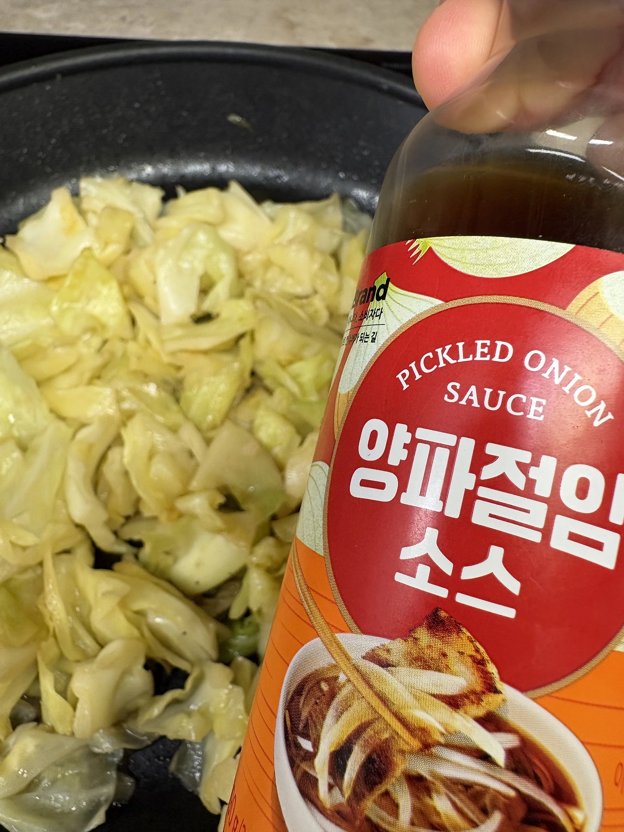 숨이 죽으면 양파절임소스 3스푼을 넣고 한 번 더 볶습니다.