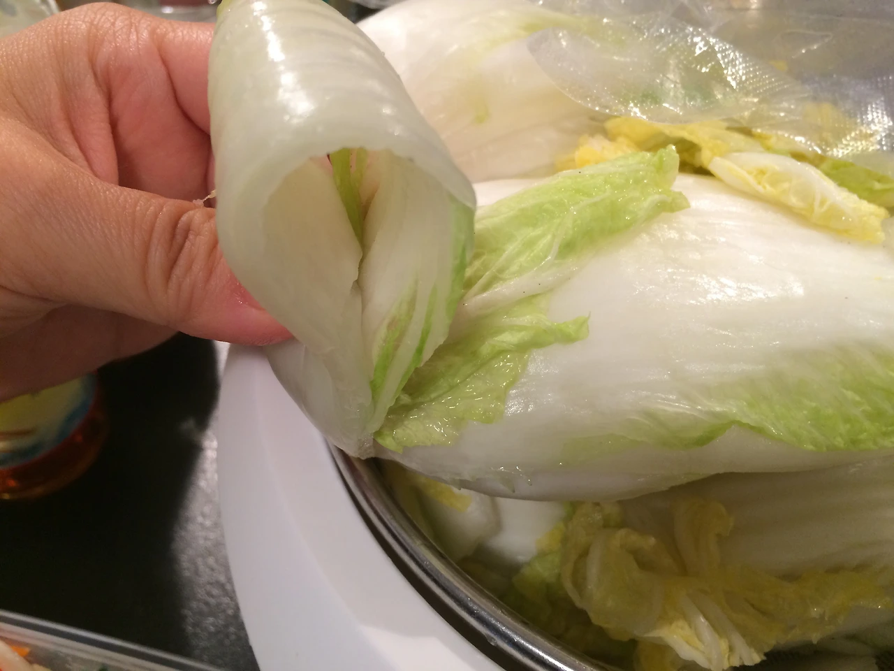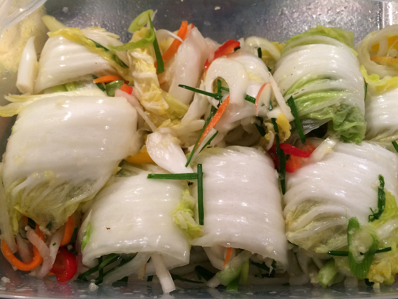 배추 머리가 붙은 포기는 김장과 같은 방법을 이용하고 배추 머리가 없는 입들은 소를 넣어 돌돌 말아준다.