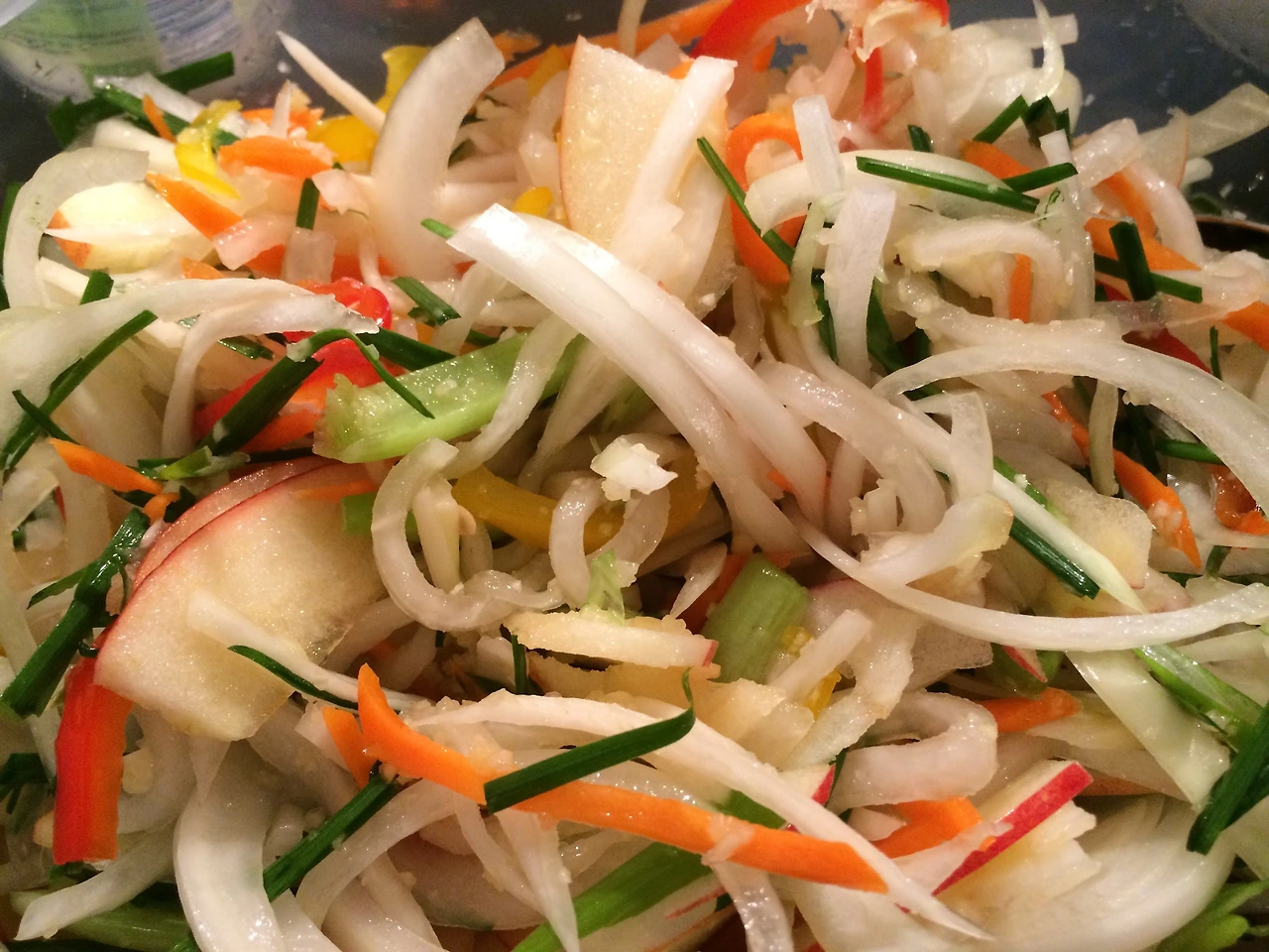 만들어 놓은 재료에 절여 놓은 다양한 채소를 모두 넣어 섞는다. 배 대신 사과를 얇게 썰어 대신했다.