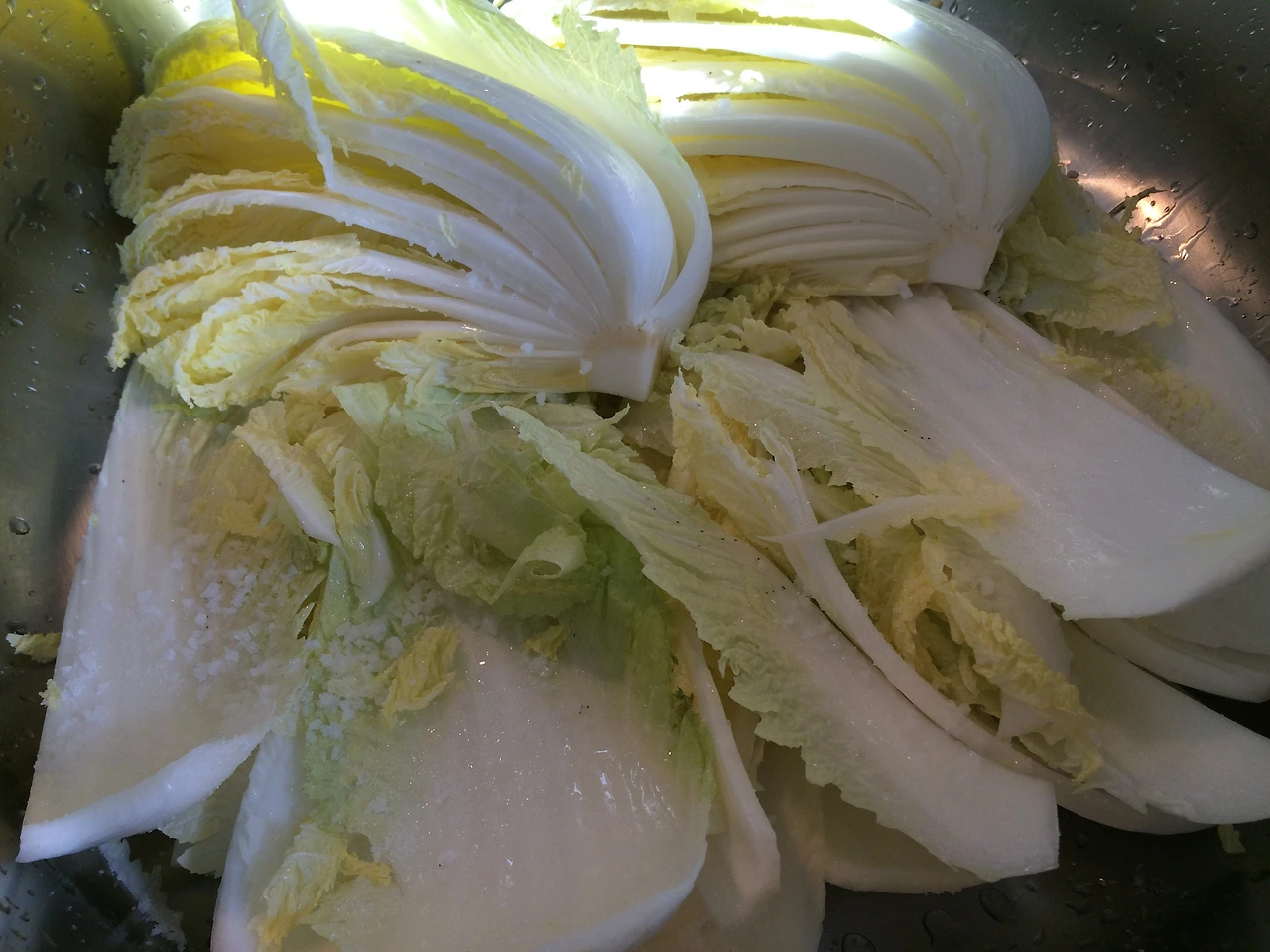 이렇게 휘어지면 ' 나 준비됐어요~'로 받아들여도 된다. 채에 바쳐 물기가 빠지는 동안 김치 안에 넣을 소를 준비한다.