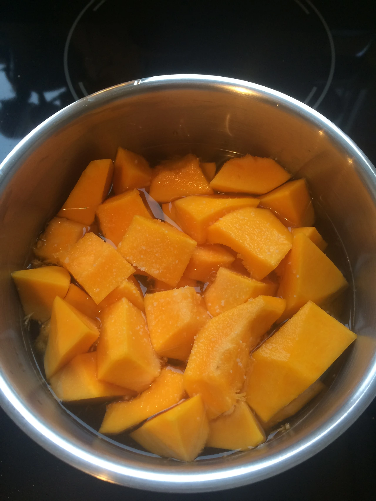 끊기 시작하면 호박의 수분으로 호박이 잠길 정도의 물로 불어나므로 처음 물은 단호박 양의 반으로 잡는 것이 알맞았다.