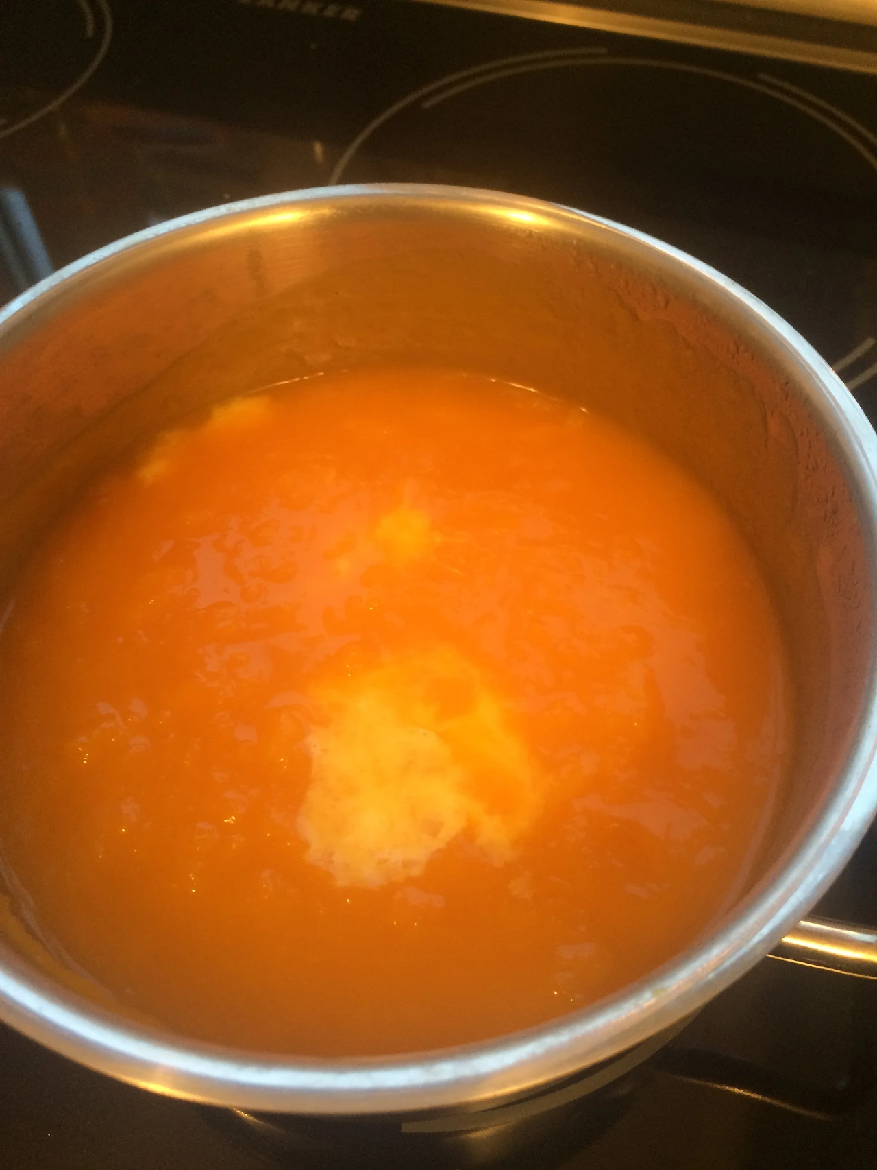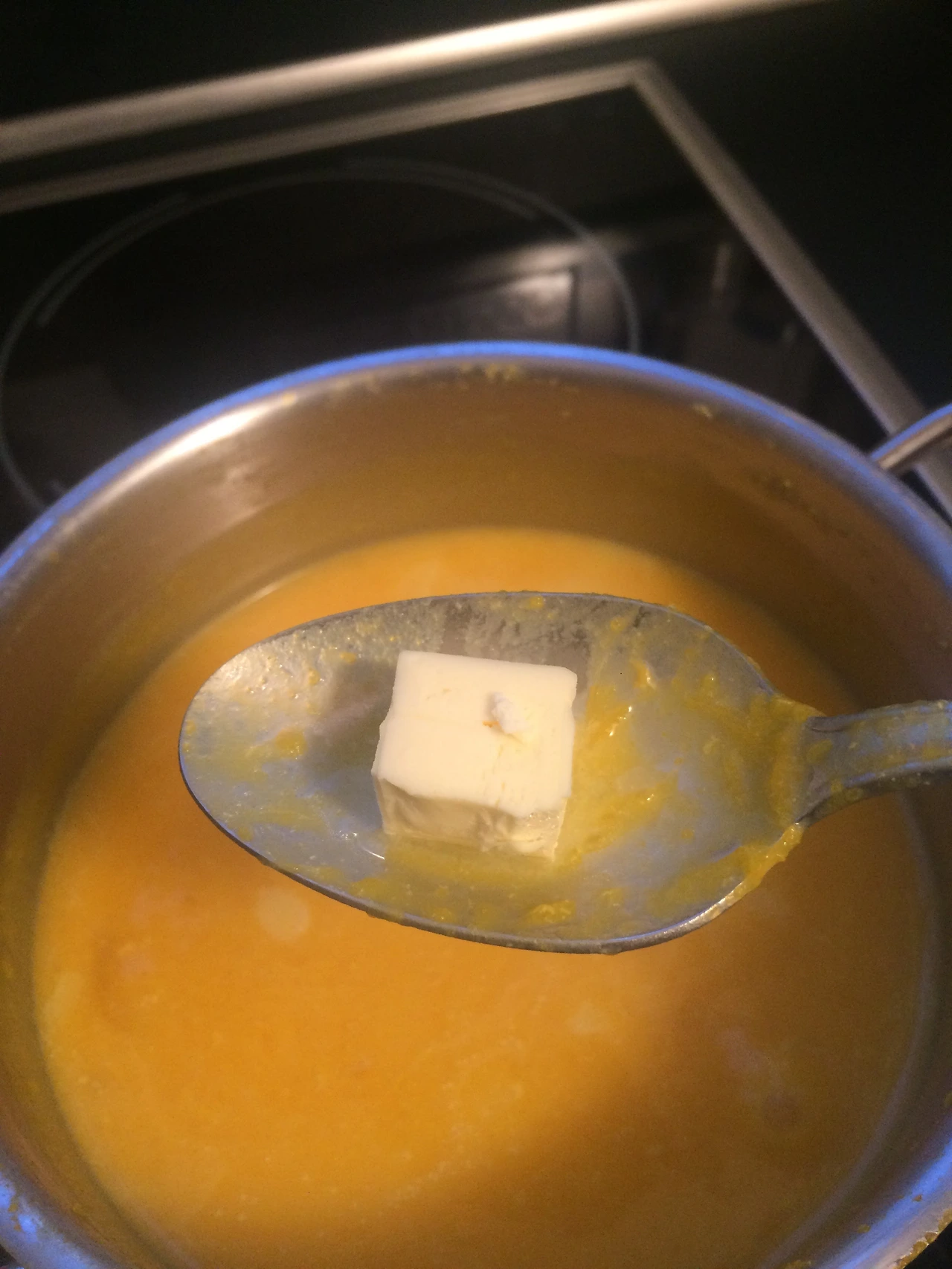 호박이 모두 물러지면 우유 반컵을 넣고 한소끔 더 끓여준 후 버터 사방 1cm 정도 크기의 버터를 넣어주어 마무리한다.