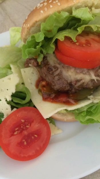 버거 안에 까망베르나 튀긴 감자 혹은 아삭한 맛을 위해 타이 새우과자를 올려도 독특한 맛을 준다.