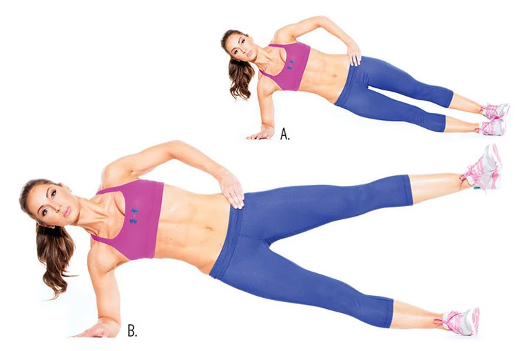 -손의 위치는 난이도에 따라 반대쪽 어깨, 허리, 들어 올릴 수도 있으며 다리 또한 쭉 뻗을 수 있다.