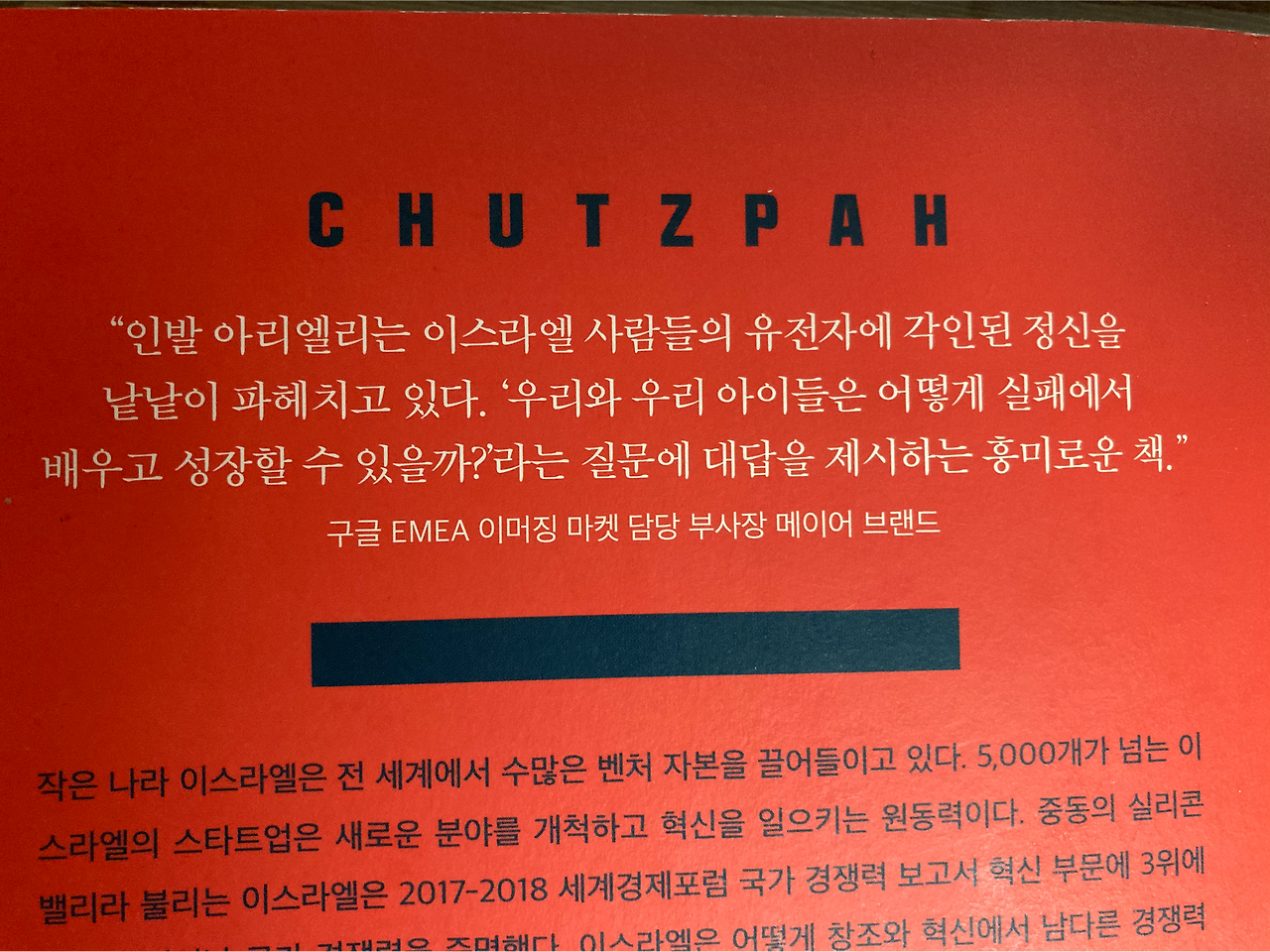 이스라엘. 이 조그마한 나라 하면 떠오르는 건 사실 중동의 느낌 정도? 가 아닐까. 그런데 이 조그마한 나라가 세계에서 스타트업 배출이 가장 많은 나라이다. 워런 버핏은 말했다. "석유를 찾아 중동에 가야 한다면 이스라엘은 들를 필요가 없다. 그러나 인재를 찾아 중동으로 간다면 이스라엘 외에는 들를 필요가 없다." 그만큼 이스라엘은 많은 인재를 지녔다. 이렇게 만은 인재를 지낼 수 있는 이유는 그들이 자라온 환경에 있다. 창조와 혁신. 이스라엘은 창조와 혁신의 성지이다. 5000개가 넘는 이스라엘의 스타트업이 이것을 증명하고 있다. 거침없이 앞으로 나아갈 줄 아는 것. 창의적으로 사고하고 실패를 두려워하지 않는 것. 끝없이 도전하고 또 도전하는 것.