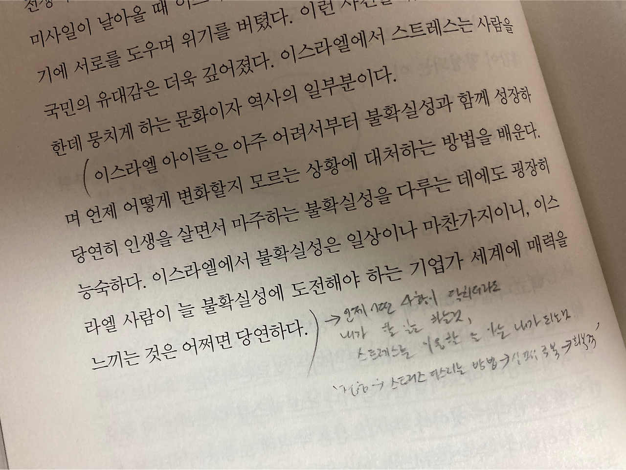 365일 테러의 위험 속에 사는 이스라엘 사람들을 보고 있노라며 내가 다 진땀이 흐른다. 역으로 내가 그 속에서 살고 있다고 생각하면.. 어유 상상도 하기 싫다. 그런데 아이러니하게도 이런 일촉즉발의 상황이 도사리는 이스라엘의 환경이 언제 어디서든, 어떤 사건이든 변화에 적응할 수 있는 능력을 학습하게 만들었다. 이스라엘 아이들은 아주 어렸을 때부터 변화와 불확실성에 대응하는 방법을 배운다. 이스라엘 집들엔 대피소가 마련되어 있고 사이렌이 울리면 우왕좌왕하며 어쩔 줄 몰라하는 우리완 달리 1분 30초 내로 대피한다. 지속적인 테러와 전쟁 위협과 공존하기에 대응법을 알 수 있고, 놀라운 회복력까지도 저절로 배운다. 불안정한 지정학적 조건으로 이스라엘의 군수산업이 발전했고, 사이버 보안 산업을 강화시켰다. 위기가 기회가 된 것이다. 이스라엘 사람들은 언제 테러와 전쟁이 일어날지 모르는 위태로운 삶이 우리를 더욱 강하고 단단하게 만든다고 믿는다.