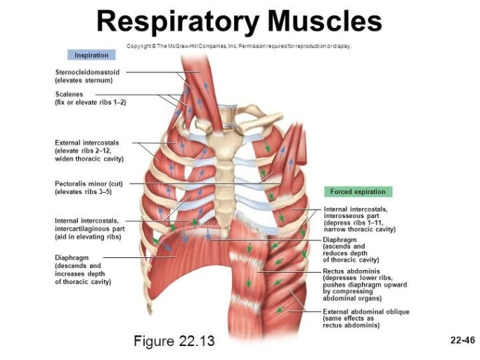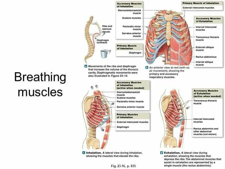 들숨 시 폐 내부로 많은 공기를 들어오게 하기 위해 횡격막이 아래로 내려가고, 갈비 사이근의 수축하면서 갈비뼈를 올리면서 흉부 부피를 횡으로 증가시킨다. 반대로 날숨시엔 들숨으로 인해 이완된 호흡근육이 수동 장력에 의해 흉부와 폐가 수축하면서 가슴의 앞뒤와 가로지름이 감소된다. 속갈비사이근이 수축되어 가슴 우리에 압력을 가하고 복부 근육 또한 복부 장기를 횡격막으로 밀어 올려 흉부의 부피를 감소시켜 날숨을 돕는다. 앞쪽의 복벽 근육들은 몸통 운동에 작용할 뿐 아니라 내부 복압을 발생시켜 숨을 내쉬는 것을 돕고, 배뇨, 기침, 분만과 같은 모든 활동도 또한 돕는다.