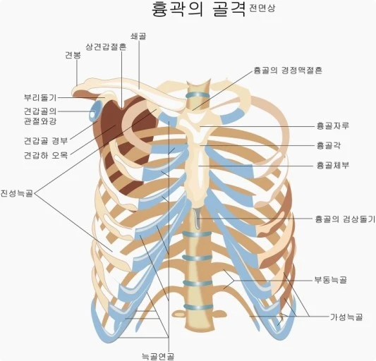 갈비뼈와 복장뼈 흉추로 이루어진 흉곽은 원통의 형태이고, 그 안으로 각종 장기들을 보호하고 있다. 특히나 흉곽을 줄이겠다 하면 갈비뼈를 줄인다고 생각하는데 일단 뼈는 줄어들지 않는다.