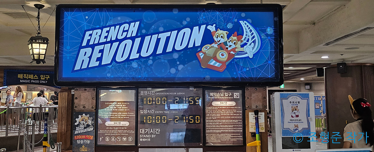 여섯 번째 어트렉션은 후렌치 레볼루션이었다. 운이 좋게도 오늘은 비수기에 속하기도 했고 밤 늦은 시간이라서 대기 시간이 줄어들어서 얼른 들어가서는 맨 앞자리를 지키는데도 성공했다. 아무래도 다리 위에 몇 명이 있는지 세는 것에서는 맨 앞자리만한 좌석이 없기 떄문이었다. 개인적으로도 무지개 다리를 지나치는 것과 함께 360도 루프 구간과 다리를 지나치는 구간은 앞으로도 평생 잊지 못할 강렬한 추억으로 남지 않을 까 한다.