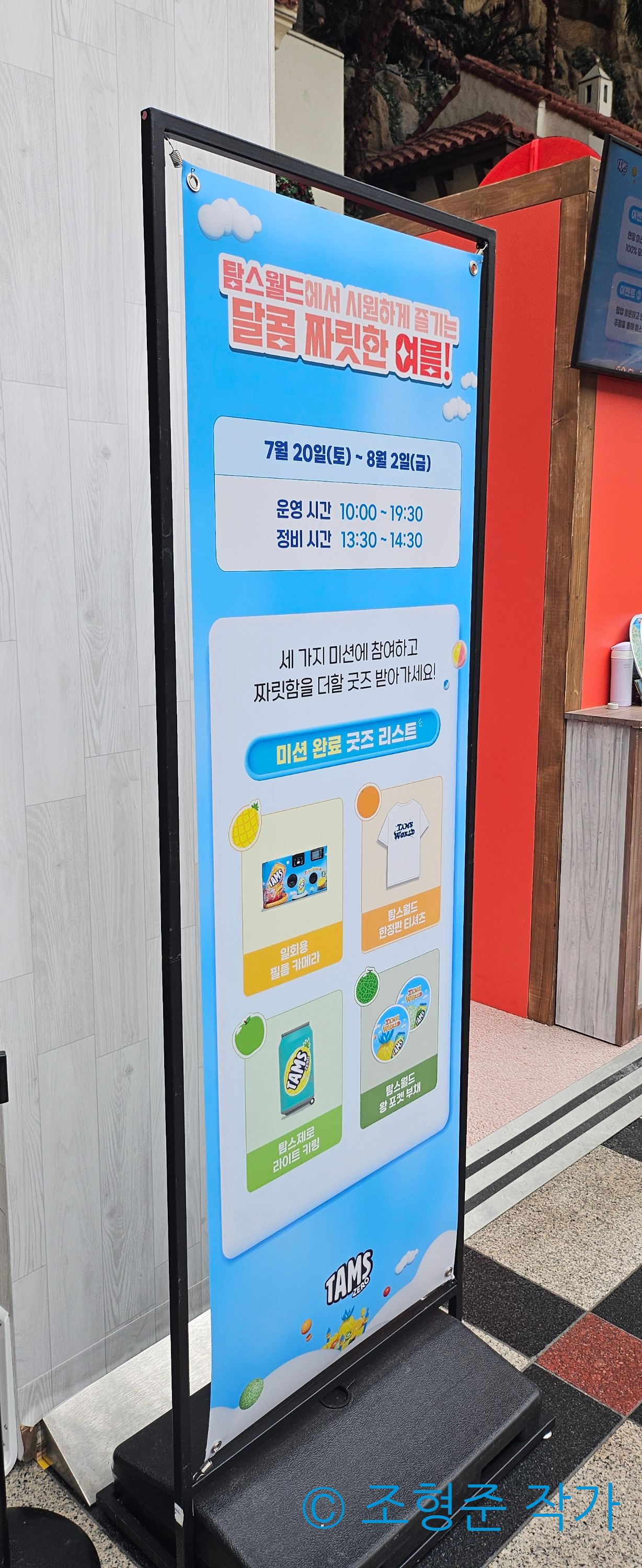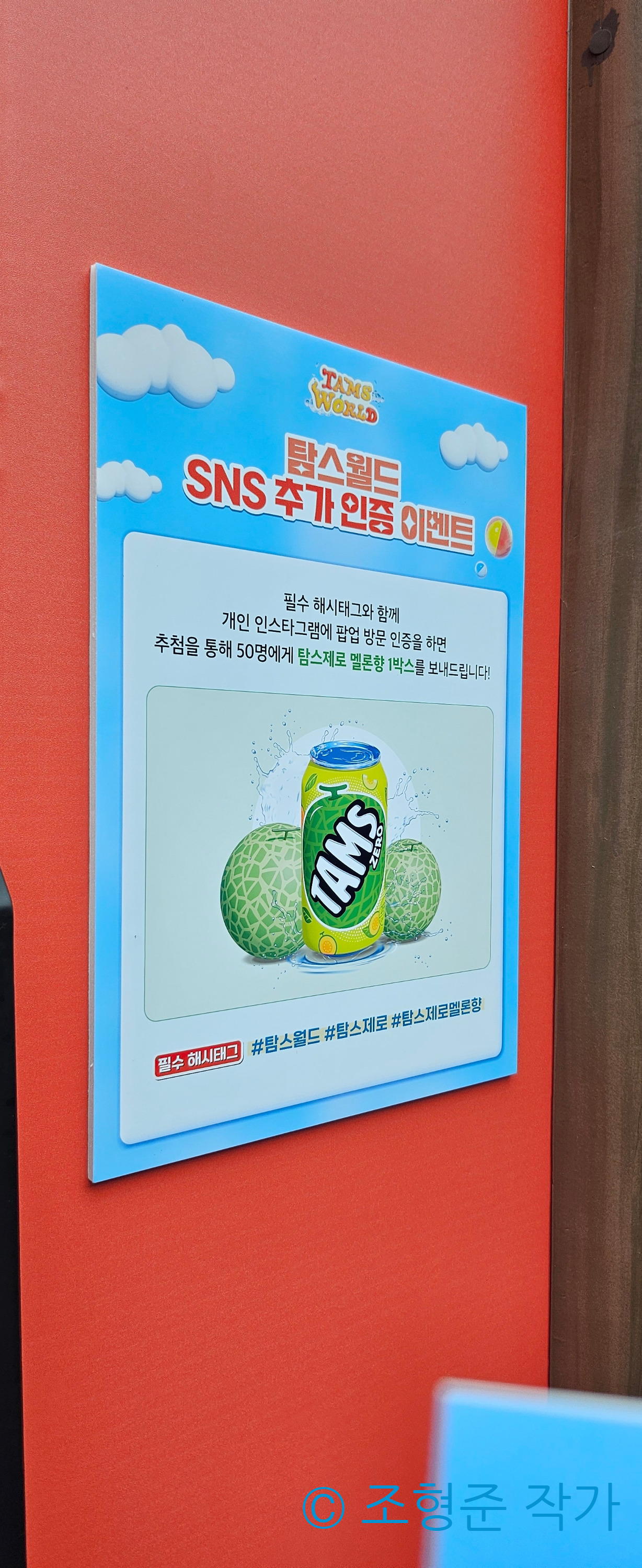 후룸라이드 탑승 직후 이번에는 탐스에서 진행하는 이벤트에 참여하기로 했다. 이 이벤트가 8월 2일에 끝나게 될 예정이었으니 타이밍이 기가 막힌 셈이었다. 총 세 가지 미션을 하면 뽑기를 통해 나온 공에 따라 다양한 굿즈들을 받을 수 있었는데 운이 좋게도 오렌지가 나와서 한정판 티셔츠와 함께 탐스 오렌지 주스까지 한 잔 받을 수 있었다. 덕분에 조금이나마 시원함을 얻으며 다음 어트렉션을 타기 위해 이동했다.