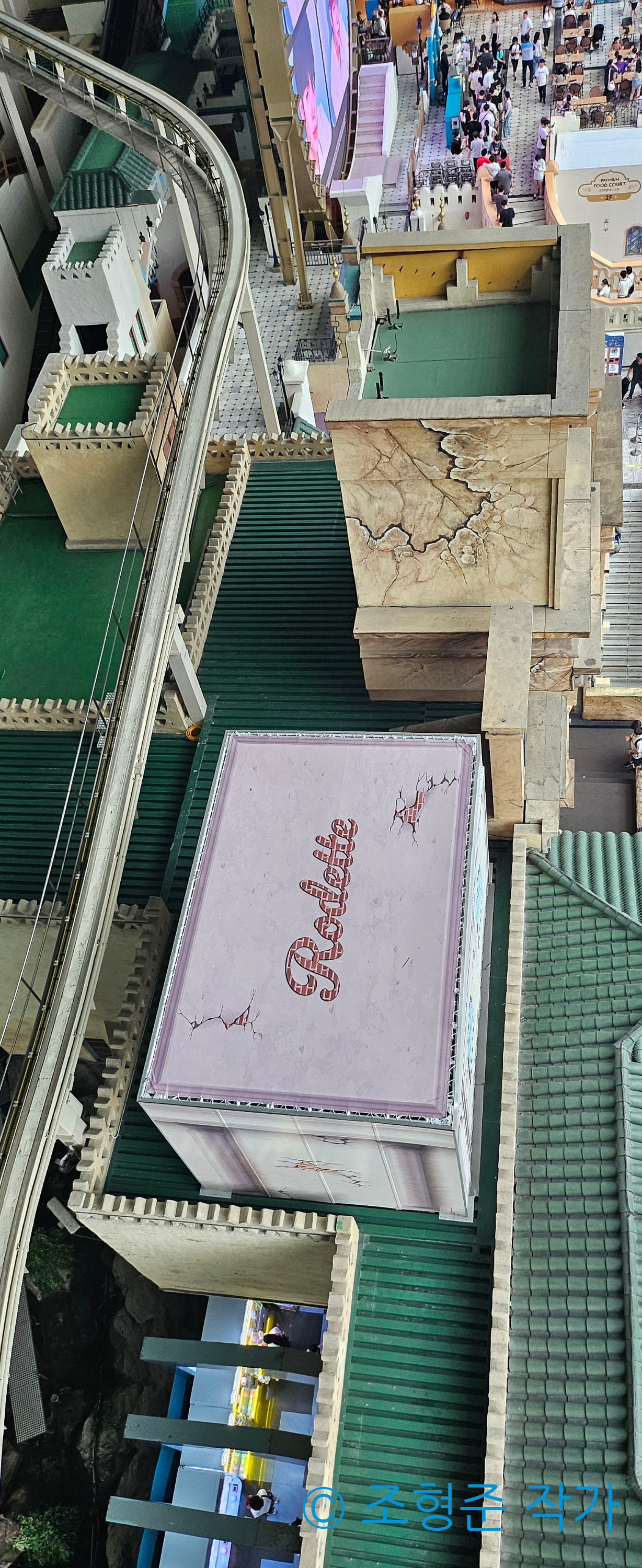 여섯 번째 어트렉션은 월드 모노레일이었다. 월드 모노레일도 대기 마감까지 단 1분을 앞뒀던 상태에서 가까스로 탔다. 참고로 어드벤처 내부임에도 자욱한 안개가 낀 이유는 일전에도 소개한 월드 오브 라이트에서 사용이 되는 불꽃놀이로 인해 생긴 것이다. 그래서 월드 오브 라이트가 막 끝날 때는 이렇게 안개가 생길 수 밖에 없다. 그리고 밤에 타는 월드 모노레일도 다양한 조명으로 화려하게 빛나는 어드벤처를 볼 수 있어서 좋았다.