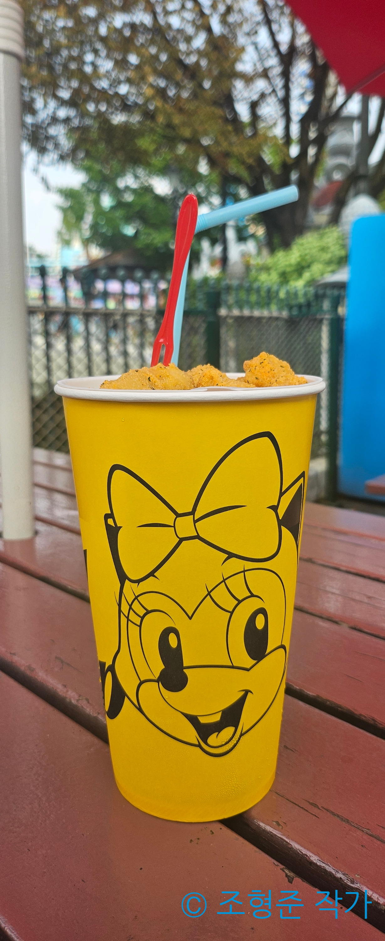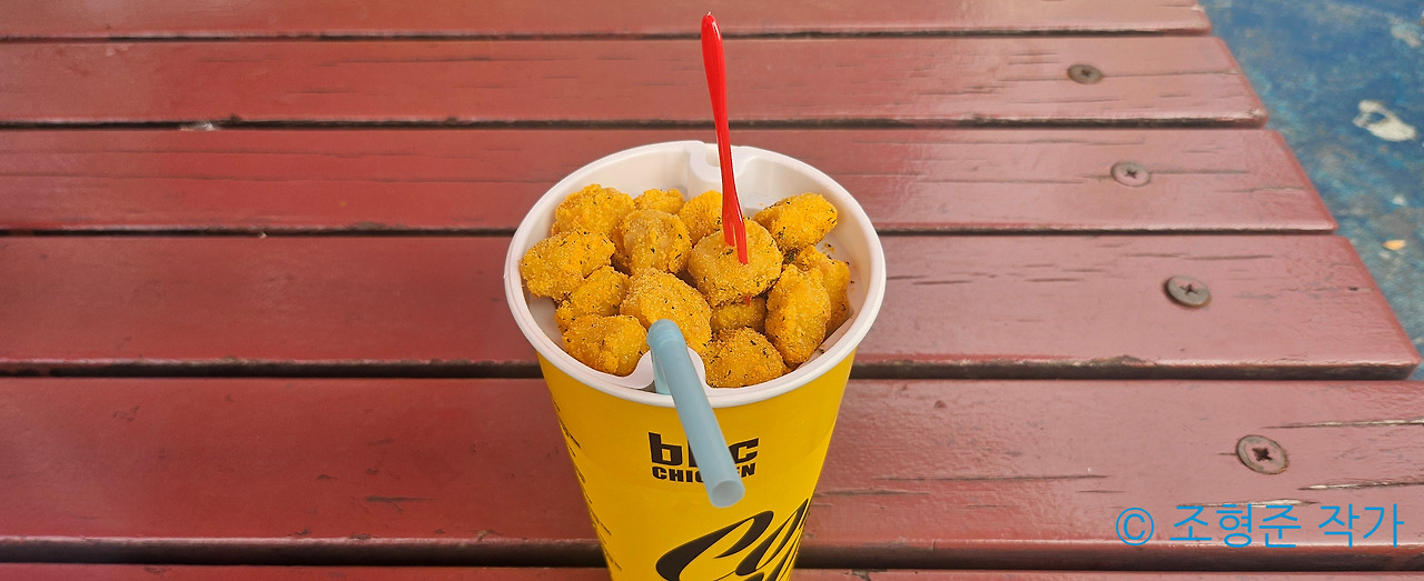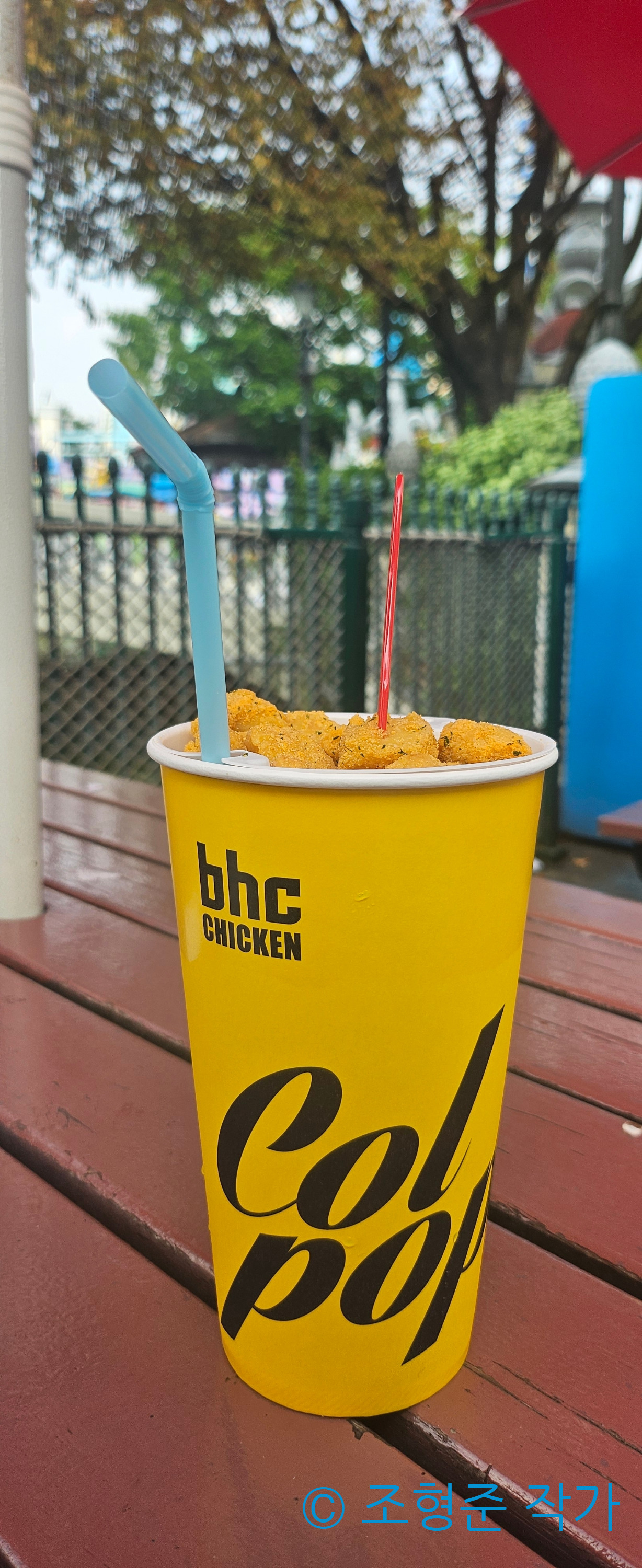 이후 아트란티스 탑승 직후 롯데월드를 떠나기 직전에 BHC의 콜팝을 주문했다. 내가 주문한 것은 콜팝 중 뿌링클 콜팝이었다. 아무래도 콜팝의 장점은 탄산음료와 함께 치킨을 먹을 수 있다는 것이었다. 특히 근처에 있는 벤치에 앉아서 먹으면 풍경이 너무 좋기 때문에 진심으로 추천하고 싶다. 그리고 롯데월드에서 주문했다는 걸 알 수 있게 롯데월드 전용으로 로티와 로리 그림이 있기 때문에 롯데월드 인증샷으로도 유용하다.