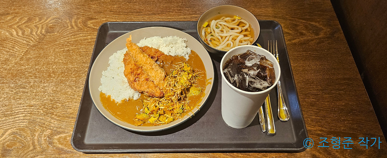 그렇게 내가 저녁을 먹은 곳은 매직타임 레스토랑이었다. 여기는 일종의 푸트코트라고 보면 되는데 여기에서 나는 돈가스새우카레 세트를 주문했다. 이건 넉넉하게 있는 밥에 돈가스와 새우를 올리고 옆에 소스를 부은 요리였다. 심지어 우동까지 세트 구성에 포함이 되었다는 게 이 메뉴를 주문하게 된 이유였다. 참고로 돈가스새우카레 세트 옆에 있는 건 3,000원짜리 콜라다. 심지어 얼음까지 준다는 것이 아주 매력적이었다.