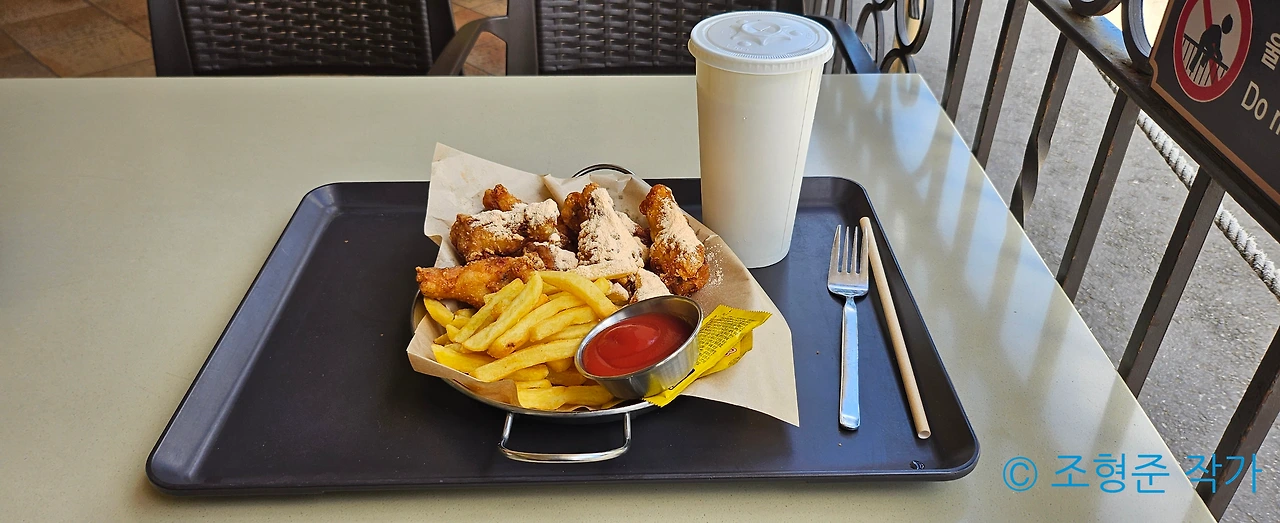 그렇게 간식을 먹고 나서 점심을 먹었는데 메뉴는 치즈뿌링치킨과 감자튀김이었고 가격은 14,800원이었다. 이와 함께 콜라도 3,000원 추가했다. 일단 치즈가 마치 눈처럼 치킨에 뿌려졌고 감자튀김도 아주 두툼했다. 그 밖에도 케찹도 넉넉하게 줬고 허니 머스터드도 케첩 옆에 있었다. 보자마자 절로 맛있겠다는 생각이 들 만큼 구성이 정말 알찼다.