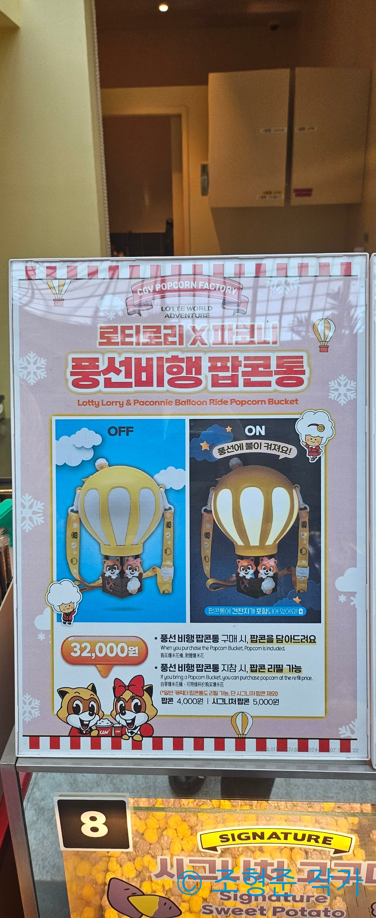 2024년 2월 1일, 롯데월드 어드벤처 내 팝콘팩토리에서 그토록 구매하고 싶었던 걸 구매했다. 그건 바로 엄청난 인기를 자랑하는 풍선비행 팝콘통이었다. 풍선비행은 열기구 모양의 비클을 타고 어드벤처 한바퀴를 도는 것인데 약 10분 정도가 걸리지만 어드벤처의 풍경을 한 눈에 볼 수 있다는 점에서도 아주 좋은 어트렉션이었다. 그런데 이를 팝콘통으로 만들었다고 하니 저절로 기대하지 않을 수 없었다. 그리고 가격도 32,000원이라서 예상보다는 저렴했다. 사실 처음 올 때부터 이 팝콘통은 구매해야 되겠다고 생각했지만 그때는 지나쳤지만 이제는 구매해야 할 때가 왔다고 생각했다. 풍선비행 팝콘통에 대한 자세한 내용은 마지막에 다뤄보겠다.