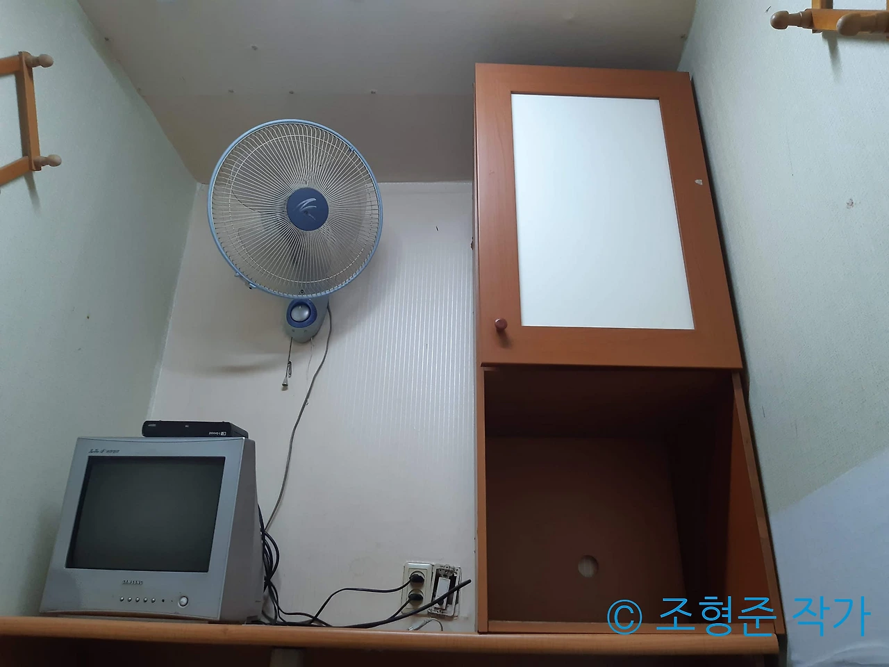 고시원 안에 들어간 나는 고시원 총무와 만나게 되었다. 고시원 총무는 4층에 위치한 부엌부터 보여줬다. 부엌에는 식당에서 주로 보이는 커다란 밥통이 있었고 밥은 넉넉하게 있었다. 심지어 라면까지 먹을 수 있었다. 그리고 내가 지낼 방도 보게 되었다. 방은 간단했다. 아주 작은 TV와 누워서 잘 수 있는 침대, 간단한 수납이 가능한 수납장, 선풍기, 옷걸이가 전부였다. 딱 잠을 잘 공간만이 존재하는 셈이지만 나에게는 이조차도 다행이었다.