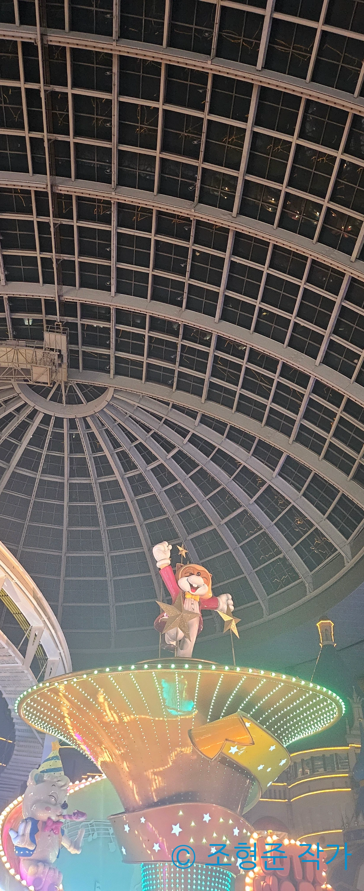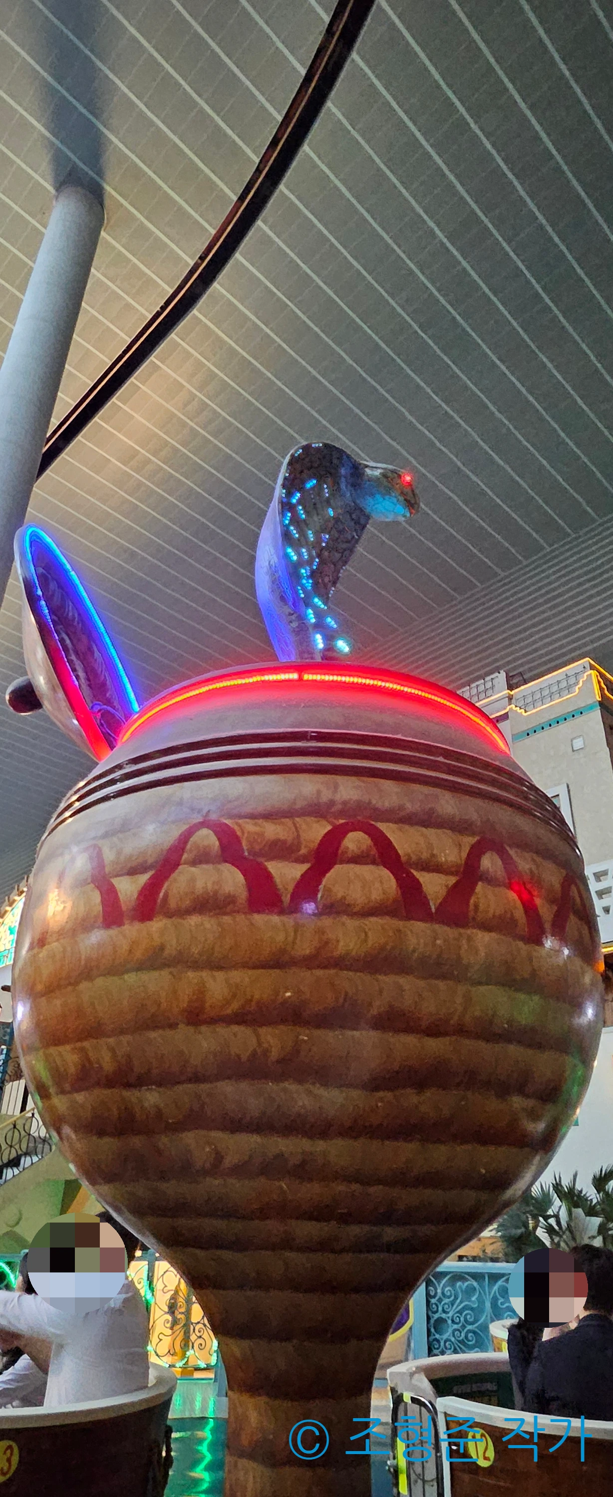 이 날은 2024년 3월 23일이었다. 롯데월드를 연간이용권으로 즐기는 나날도 어느덧 4개월이 넘었다. 원래라면 오전 10시부터 오후 9시 혹은 오후 10시까지 풀타임으로 즐기는 것도 좋겠지만 하루종일 지내는 것의 단점이면 최소한 몇 번은 배터리를 충전시켜야 한다는 것이다. 롯데월드 내에는 유료로 운영되는 보조배터리 대여소가 아닐 경우에는 스마트폰 충전은 꿈도 꾸지 못한다. 그래서 이를 사전에 막기 위해 보조배터리까지 구매해서 유용하게 사용하고 있다. 그 밖에도 발이 아파올 때가 있기 때문에 가끔이지만 밤 늦게 롯데월드를 즐길 때도 있다. 그 날이 바로 오늘이었다. 내가 처음으로 탄 건 회전바구니였다. 회전바구니에 있는 커다란 뱀이 있는 조형물은 밤이 되면 화려한 조명이 빛나서 훨씬 더 빛났다.